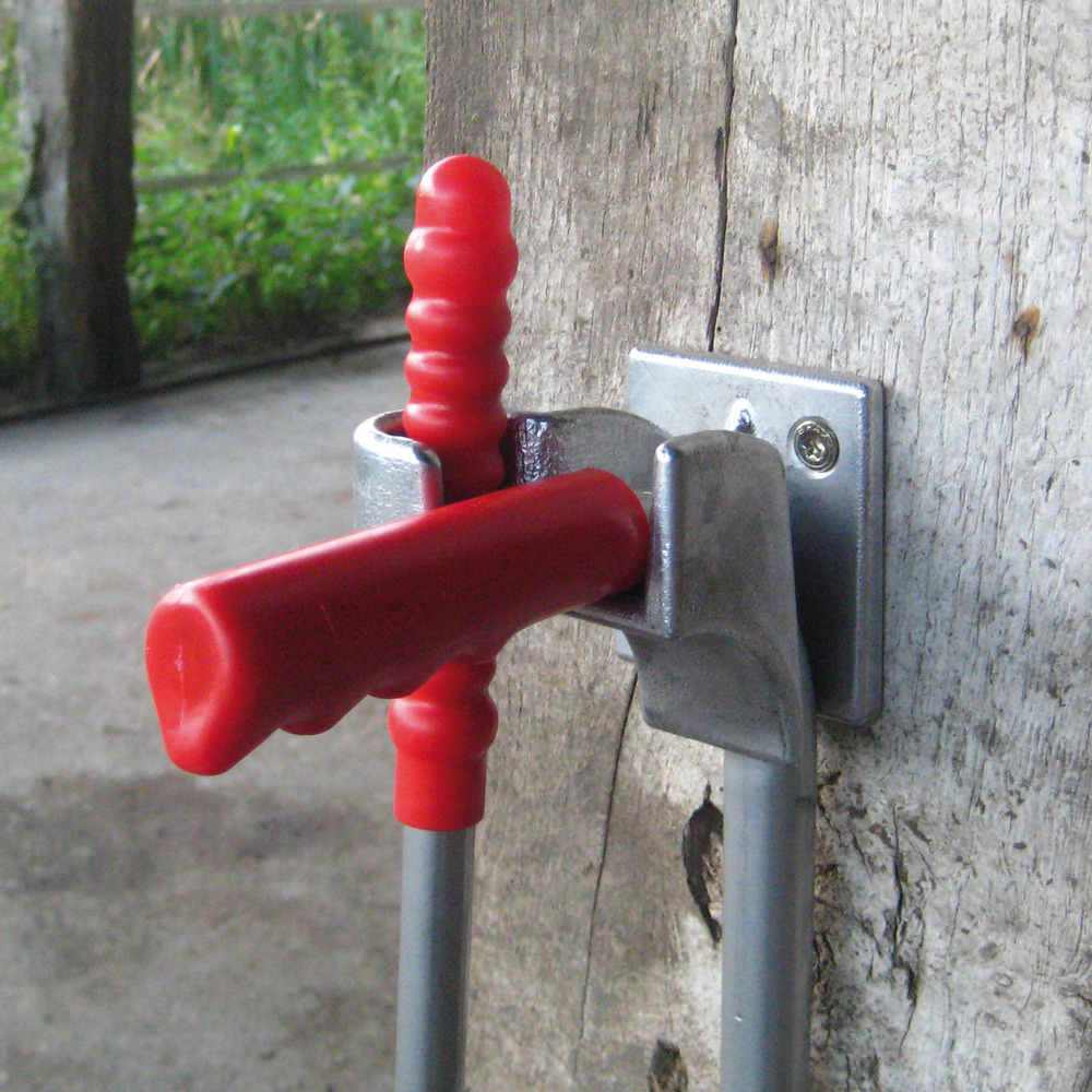 Hochwertige, patentierte Haltevorrichtung für den Mistboy (Best.Nr. 18142, 20031, 21617). Endlich kein im Weg stehen oder im Dreck liegen mehr. Die Kanten der Halterung sind abgerundet, so dass das Verletzungsrisiko minimiert wird.