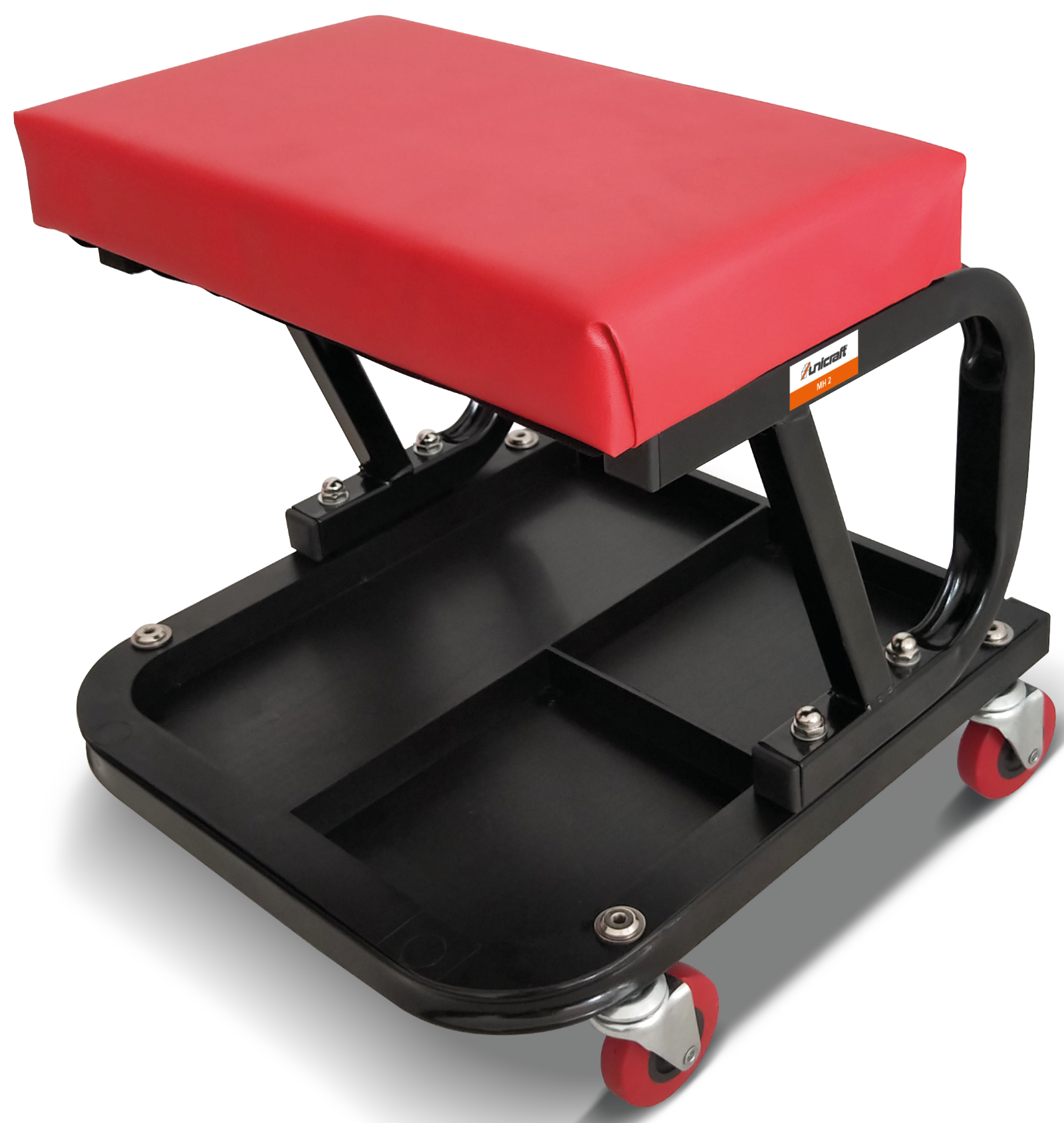 Praktischer Montagehocker mit 4 Lenkrollen und nützlicher Werkzeugablage mit Unterteilung.Komfortable und unempfindlicher Sitzpolster mit 370 mm Breite.Sitzhöhe 380 mm, Stützlast max. 120 Kg,Abmessung: 365 x 370 x 380 mm L x B x H.