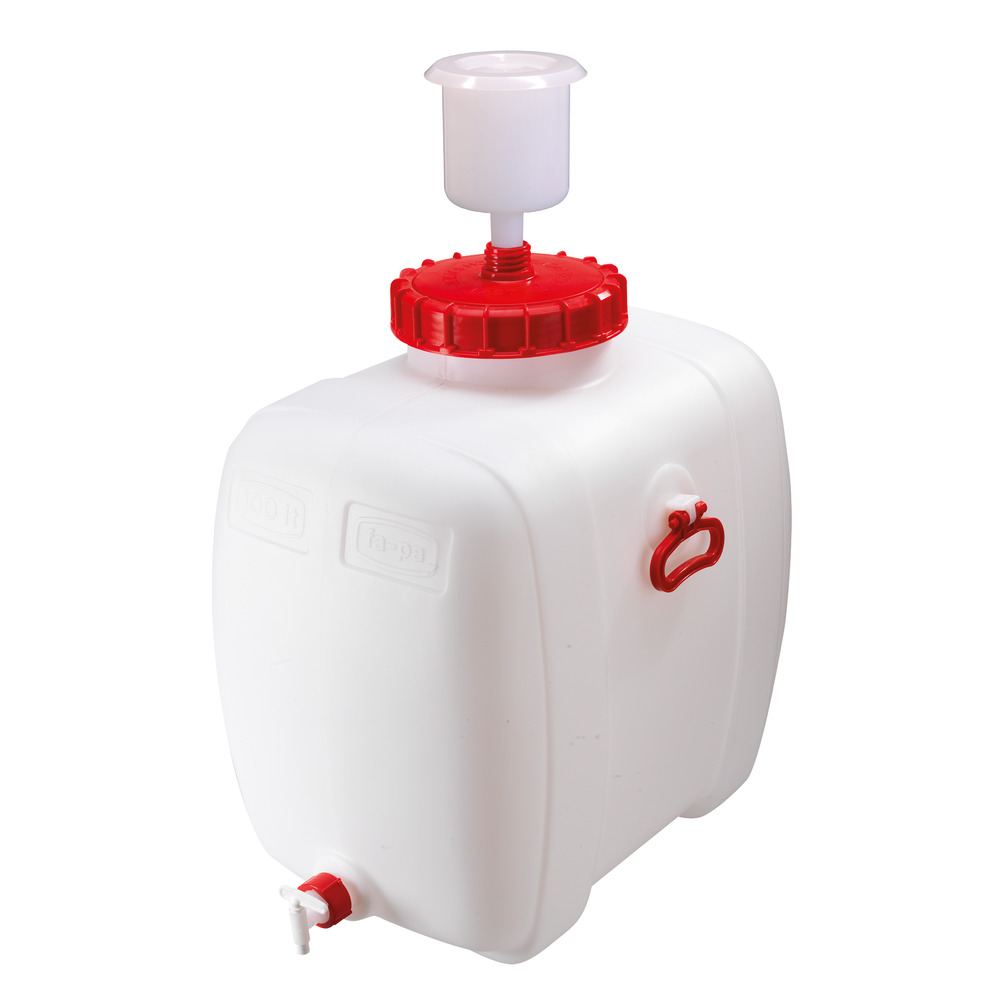 Aus hochwertigen, lebensmittelechten PE-Kunststoff. Naturweiß (Füllstand gut sichtbar), Oberfläche glatt, daher leicht zu reinigen, stoß- und schlagfest mit 2 Tragegriffen, inklusive Zapfhahn NW10, Schraubkappe und Gärglocke. Temperaturbeständig von -20° bis +80°C.