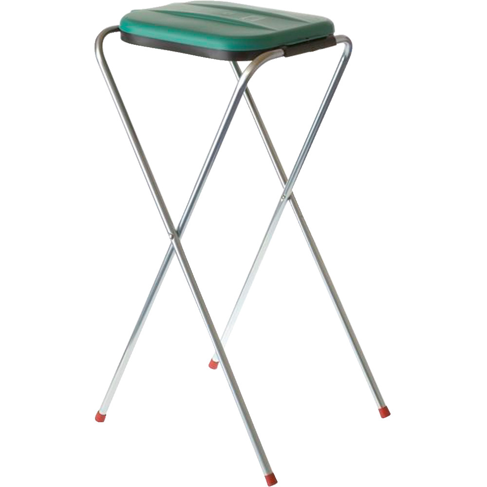 Platzsparender Müllsackständer aus robustem Rohrgestell und rutschfesten Kappen auf den Füßen.Farbig sortierter Kunststoffdeckel mit Klemmring zur Sackbefestigung.Für 70l-120l Säcke.