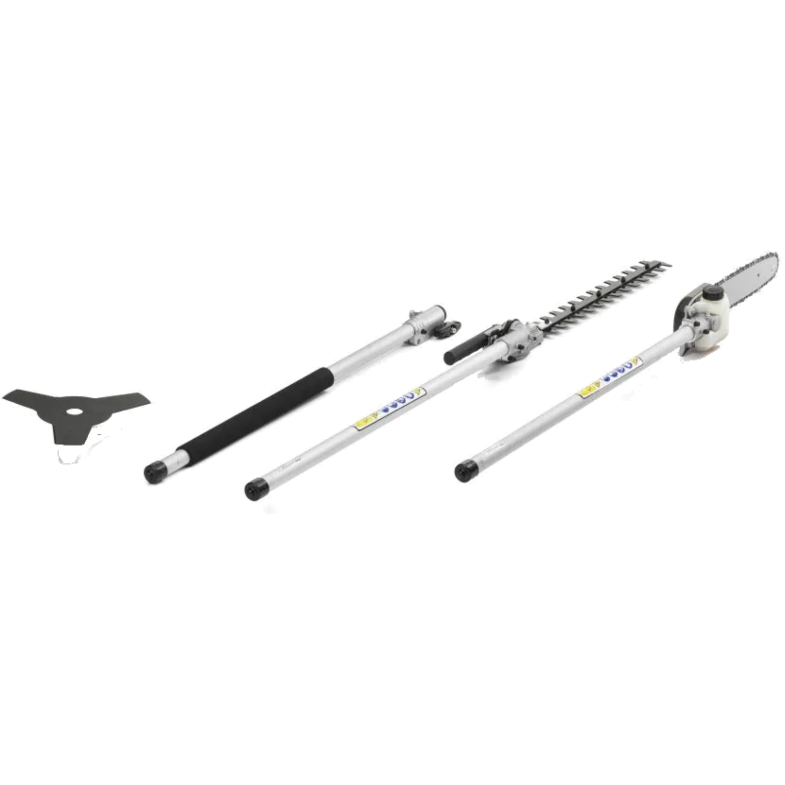 5-in-1 Multitool mit 25,4-cm³ Motor, das mit den mitgelieferten Zubehör als Motorsense mit Trimmerkopf oder Metallmesser, Heckenschere oder Hochentaster eingesetzt werden kann.