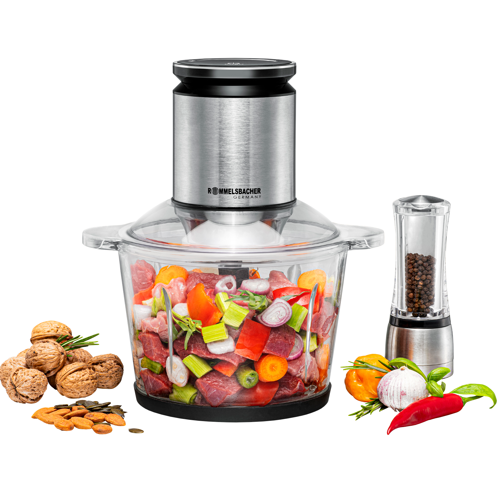 Extra stark - extra groß - für perfekte Ergebnisse in ihrer Küche Hacken, schneiden, pürieren, vermischen – mit einem leichten Druck auf die Start/Stopp Taste verarbeitet das Gerät Zwiebeln, Kräuter, Gemüse, Obst, Nüsse, Fleisch & mehr.Dabei lässt sich die Drehzahl des Messers in 22 Stufen regulieren, so dass jedes Lebensmittel perfekt zerkleinert, jede Mischung perfekt zubereitet wird.Im Handumdrehen entstehen gesunde, vitaminreiche Rohkostsalate, cremige Brotaufstriche, fantasievolle Dips, Pesto und noch viel mehr. Die vielflügeligen Messer (6 beim MZ 600, 9 beim MZ 800) sind aus rostfreiem Edelstahl, arbeiten durch ihre Anordnung extra effizient und liefern perfekte Ergebnisse.Der klare Glasbehälter ist äußerst robust, lebensmittelneutral, hygienisch und sehr leicht zu reinigen.Ein kraftvoller Motor meistert alle Anforderungen leise und vibrationsarm und integrierte Sicherheitsfeatures machen das Arbeiten sicher.Zur leichten Reinigung können alle abnehmbaren Teile in die Spülmaschine. Maße:25,50 x 20,00 x 28,50 cmFassungsvermögen: 2,7 LiterLeistung: 800 W