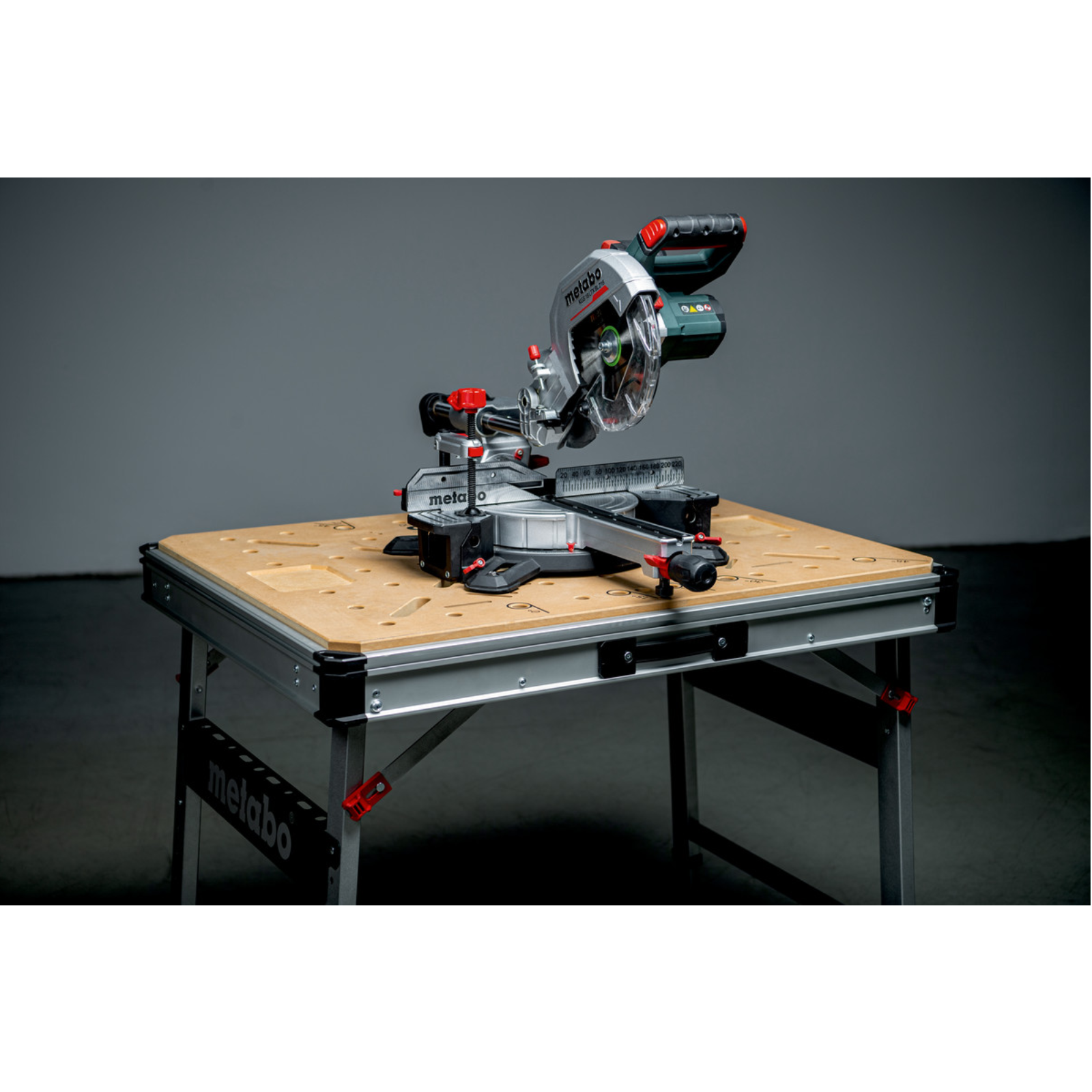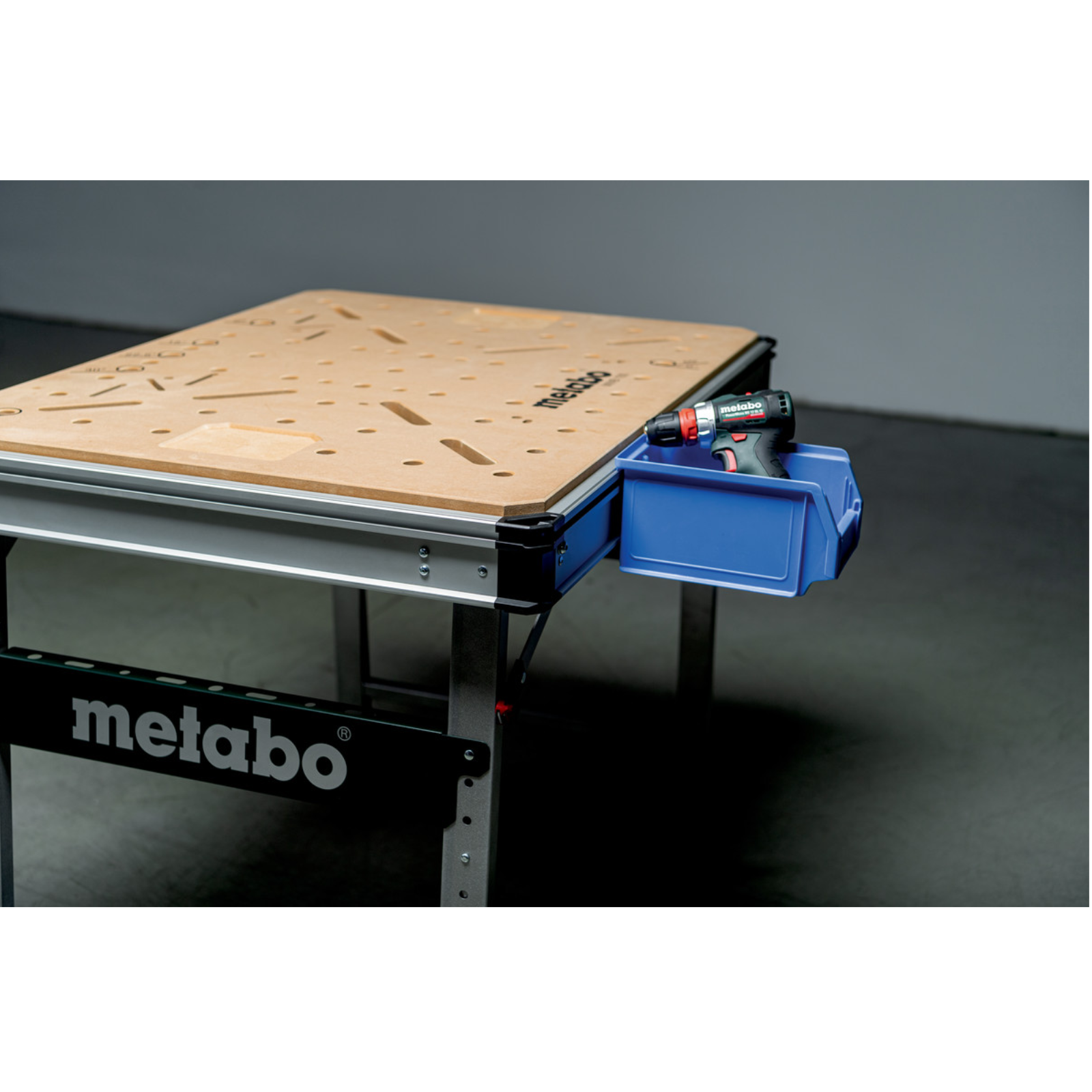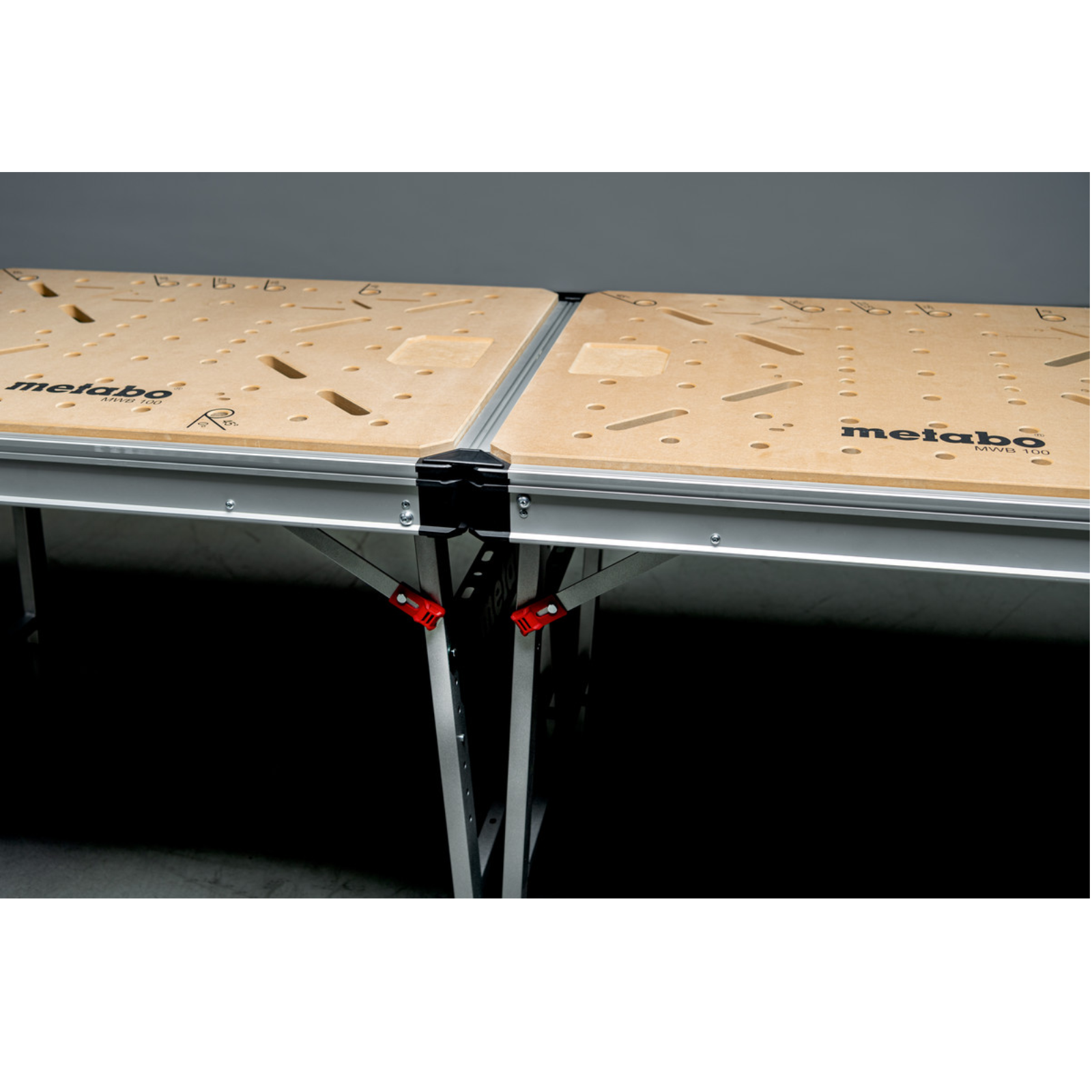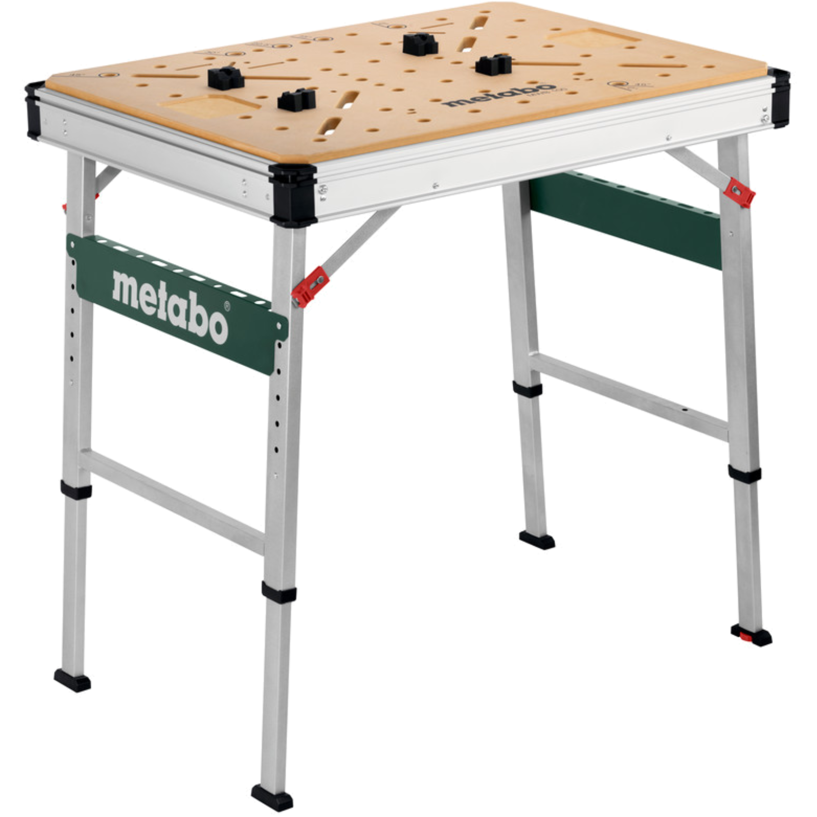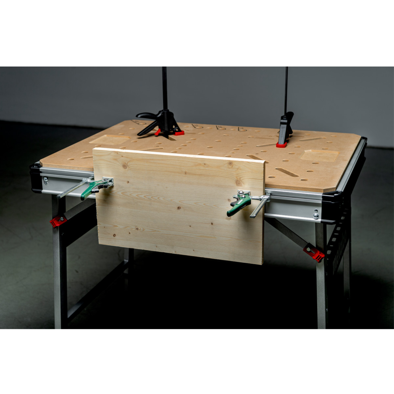 Leicht zu transportieren (nur 22 kg), Tragkraft 120 kg, MDF-Tischplatte mit 960 x 710 x 20 mm und 20 mm Lochrastung.