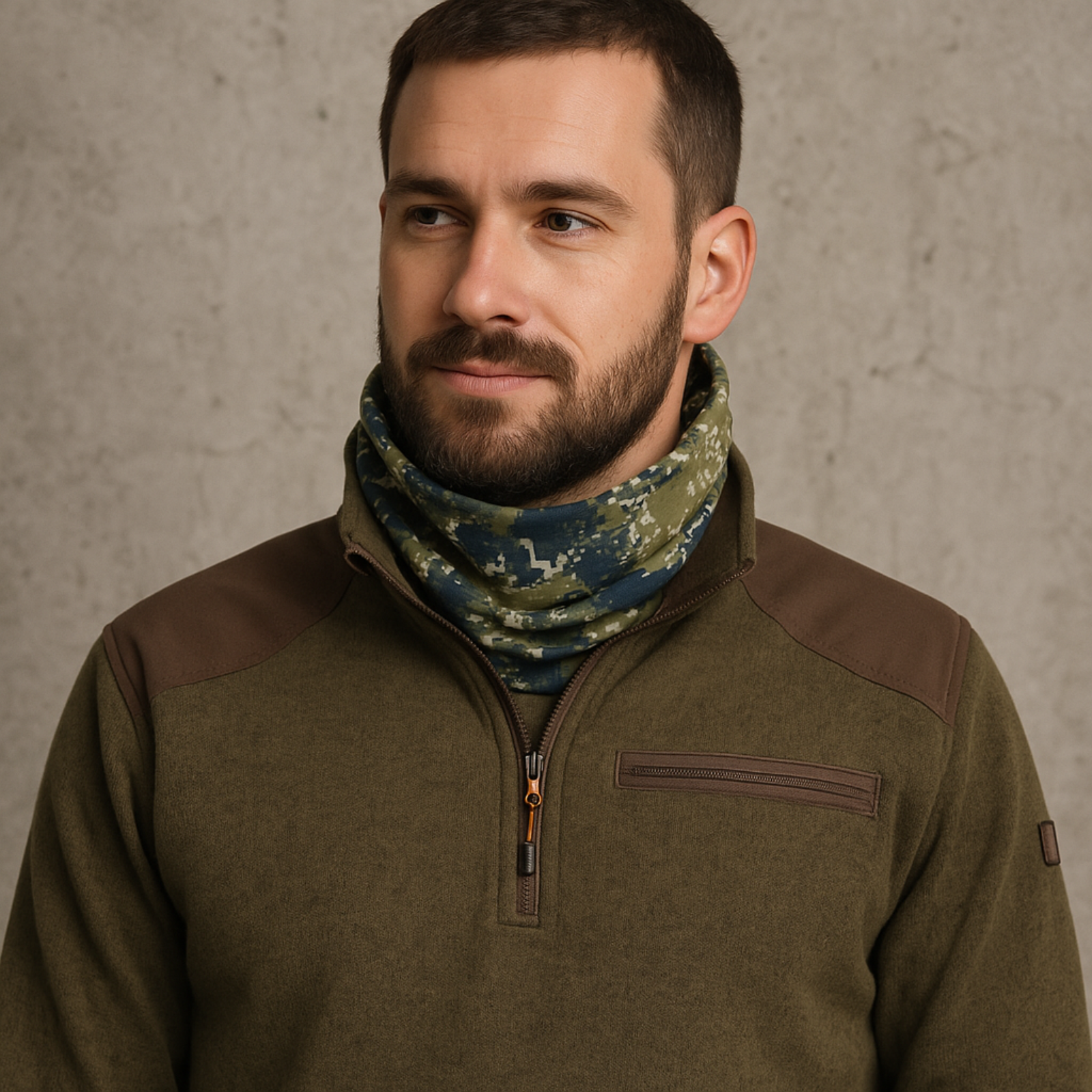 Dieses Multifunktionstuch in olivgrünem Tarnmuster ist der perfekte Begleiter für Arbeit, Freizeit und Jagd.