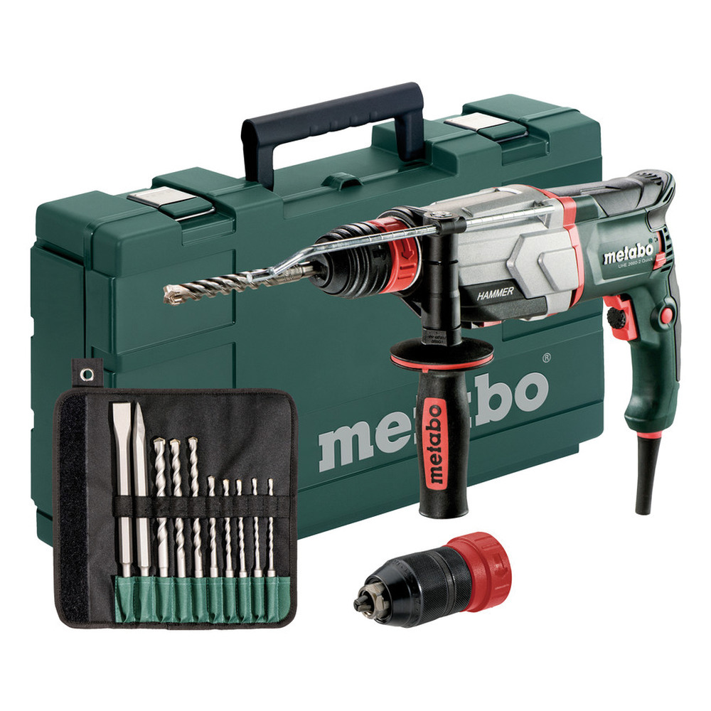 Set bestehend aus dem kraftvollem Multihammer, zusätzlichem Schnellspannfutter und praktischem SDS Plus Bohrer- und Meißelsatz. Der Hammer kann zum Bohren ohne Schlag in zwei Gängen, zum Hammerbohren und zum Meißeln verwendet werden. Mit dem Metabo Quick System ist ein Schnellwechsel zwischen SDS-Plus Hammerfutter und Schnellspannfutter zum Bohren in Holz und Metall schnell und einfach möglich.
