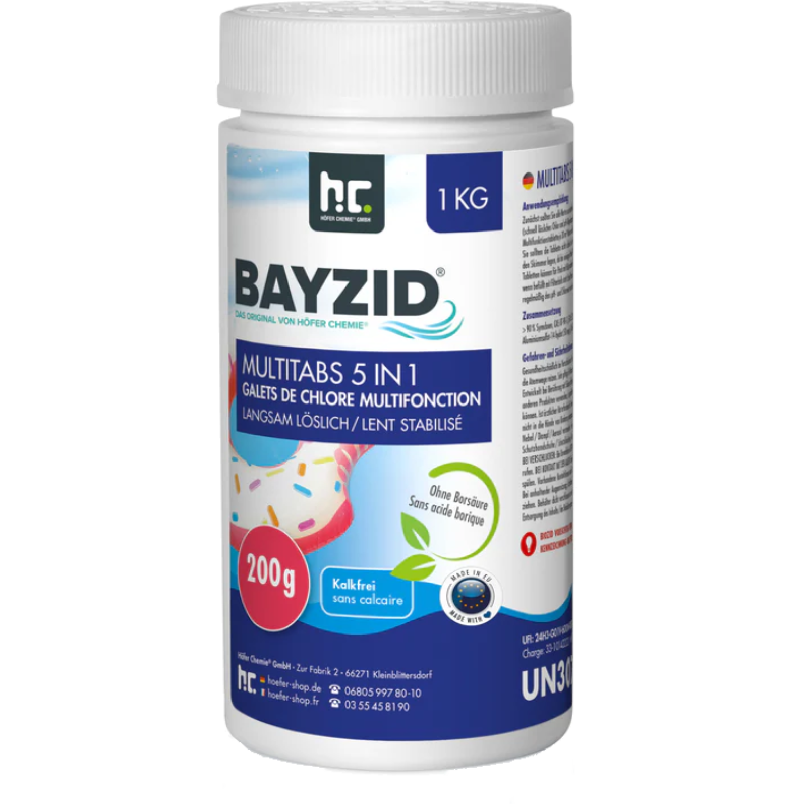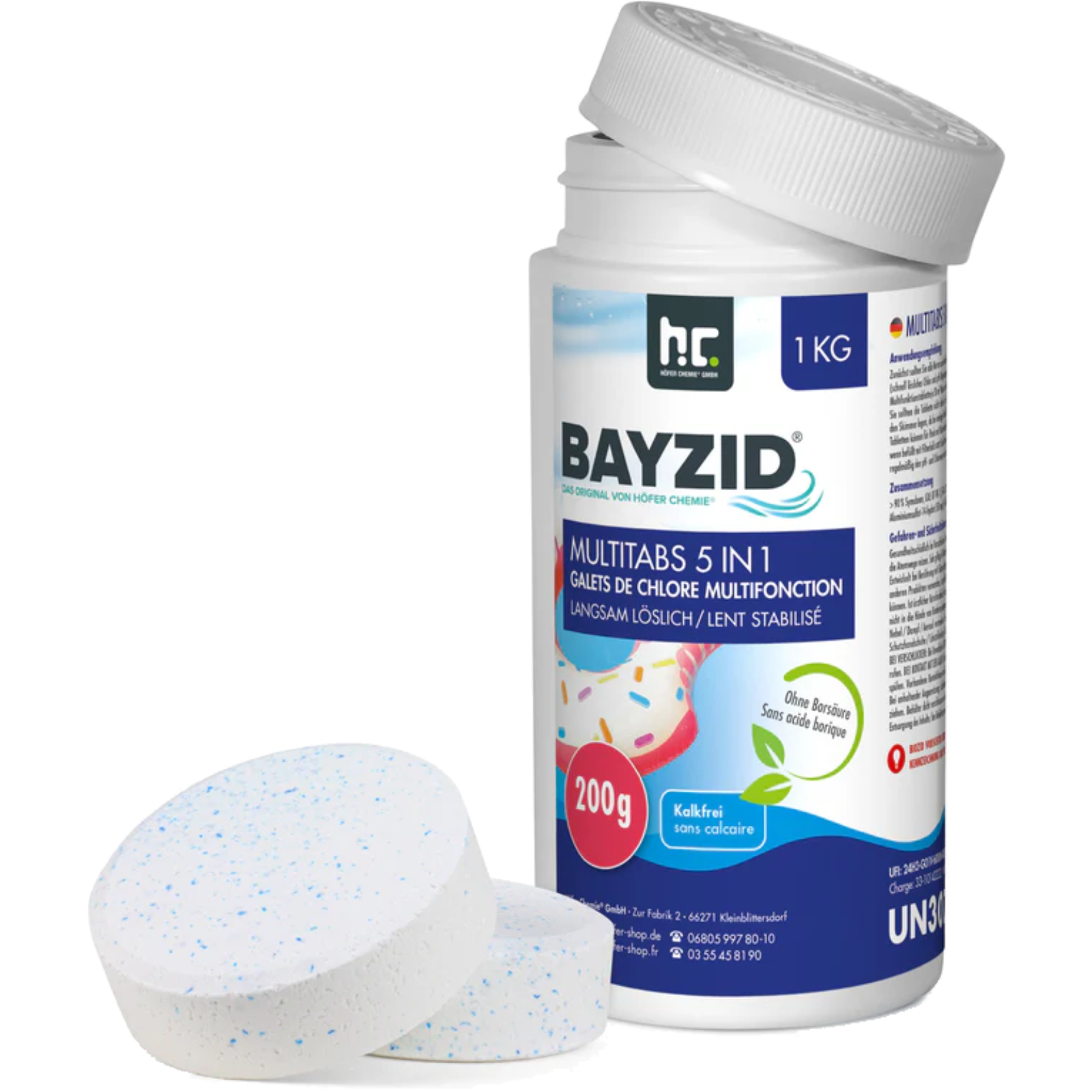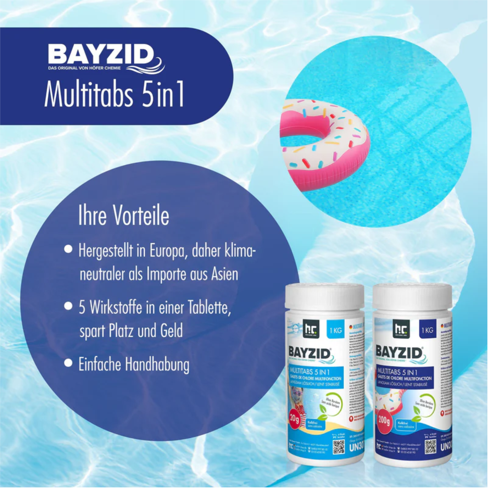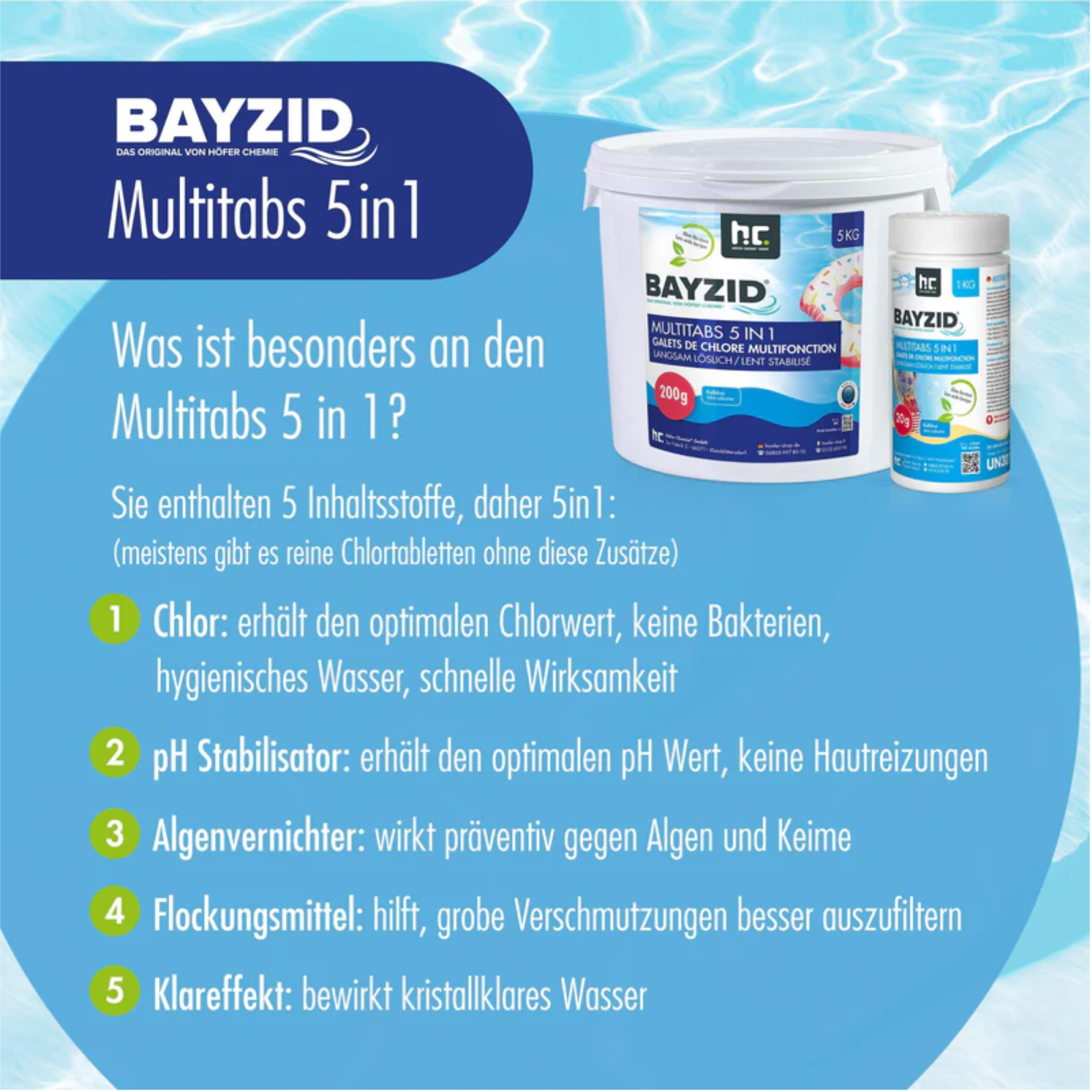 BAYZID® Multitabs 200g 5 in 1 – langsam löslichMit diesen Multitabs wird die Poolpflege besonders einfach und zuverlässig.Ob im Alltag oder während des Urlaubs – dank der 5-in-1-Wirkung sorgen die Tabletten dauerhaft für klares, hygienisch reines Wasser und eine effektive Desinfektion.Wie funktionieren die Chlor Multitabs?Die langsam löslichen Multitabs vereinen mehrere Wirkstoffe in einer Tablette. Neben aktivem Chlor zur Desinfektion liefern sie zusätzliche Bestandteile, die wichtige Wasserwerte stabil halten – ganz automatisch. So bleibt Ihr Pool stets in bestem Zustand und dem unbeschwerten Badevergnügen steht nichts im Weg.Vor dem Einsatz ist jedoch eine Erstbehandlung erforderlich: Führen Sie eine Stoßchlorung mit schnell löslichem Chlor durch und stellen Sie den pH-Wert mithilfe eines pH-Hebers oder -Senkers korrekt ein. Erst danach entfalten die Multitabs ihre volle Wirkung.Inhaltsstoffe:langsam lösliches Chlor mind. 90%pH StabilisatorAlgenvernichterFlockungsmittelKlareffektUnsere Multitabs sind organisch und kalkfrei.Dosierung:Zunächst sollten Sie alle Werte so einstellen, dass der optimale Bereich erreicht ist (schnell lösliches Chlor und pH-Regulierungsmittel). Erst dann geben Sie eine Chlor-Multifunktionstablette pro 30 m³ Wasser alle 5-8 Tage in einen Dosierschwimmer. Sie sollten die Tablette nicht direkt in das Becken werfen und auch nicht in den Skimmer legen, da bei einigen Pools Bleichflecken entstehen können. Zusätzlich besteht bei einer Nichtfunktion der Filtration die Gefahr, dass die Chlorkonzentration im Skimmerbereich so hoch wird, dass dieser inklusive der Folie (falls vorhanden) angegriffen werden kann.Diese Tabletten können für Pools mit Kartuschenfiltern und für Sandfilteranlagen (auch wenn befüllt mit Filterballs statt Sand) benutzt werden. Kontrollieren Sie weiterhin regelmäßig den pH- und Chlorwert und stellen Sie ihn gegebenenfalls neu ein. Optimaler Chlorwert: 0,6 - 1,5 mg/l (je nach Technik, Besucherzahl und Temperatur bis zu 2 mg/l; bei Verwendung von Kartuschenfiltern bis zu 3,0 mg/l).Zulassung von Kupfersulfat-Pentahydrat (ist nicht identisch mit Kupfersulfat!) als Wirkstoff zur Verwendung in BiozidproduktenBiozidprodukte vorsichtig verwenden. Vor Gebrauch stets Etikett und Produktinformationen lesen.Achtung ! H302: Gesundheitsschädlich bei Verschlucken. H319: Verursacht schwere Augenreizung. H335: Kann die Atemwege reizen. H410:Sehr giftig für Wasserorganismen mit langfristiger Wirkung.Weitere Informationen:Biozid Registrierungsnummer: N-63988Gefahrenklasse: 4.1: WassergefährdendKindersicherheitsverschluss: NeinLagerung: Frostgeschützt, im Original Gebinde, kühl und trocken lagernHaltbarkeit: 3 - 4 Jahre nach Kaufdatum