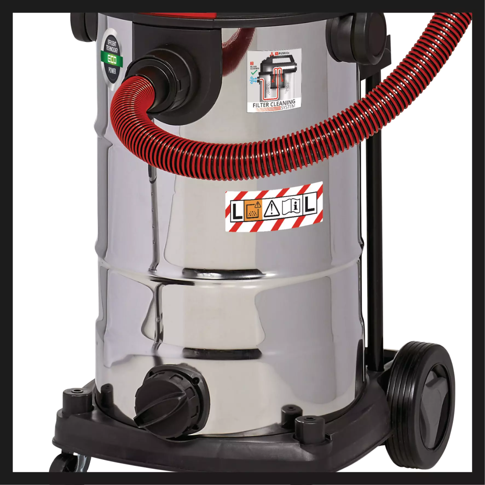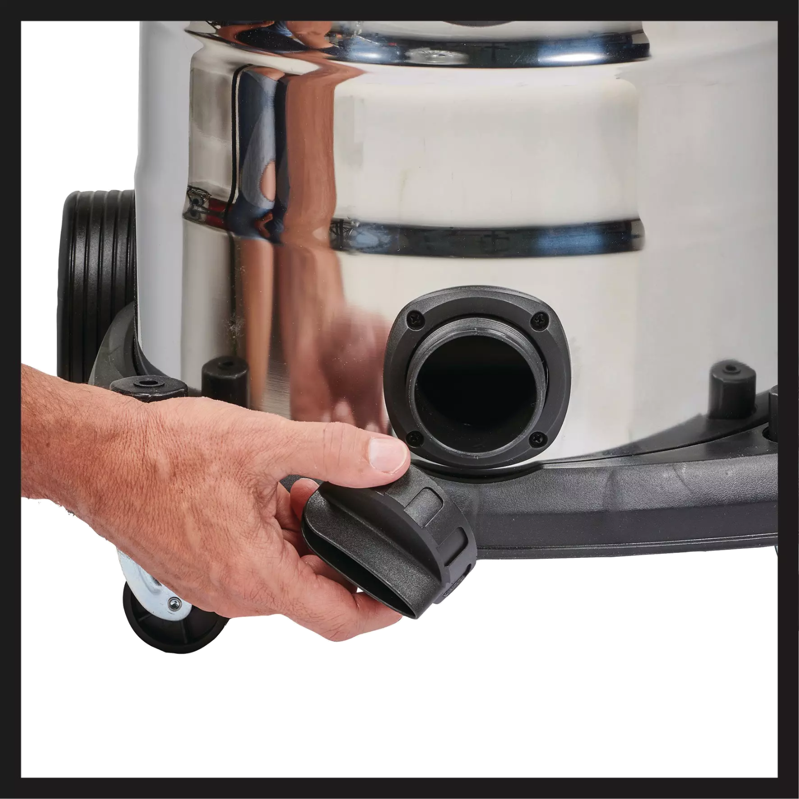 Ein Blasanschluss ermöglicht die zusätzliche Nutzung als Blasgerät. Der 40l große Edelstahlbehälter verfügt über große Räder für einen einfachen Transport und einen Ablass zum einfachen Entleeren bei der Verwendung als Nass-Sauger.