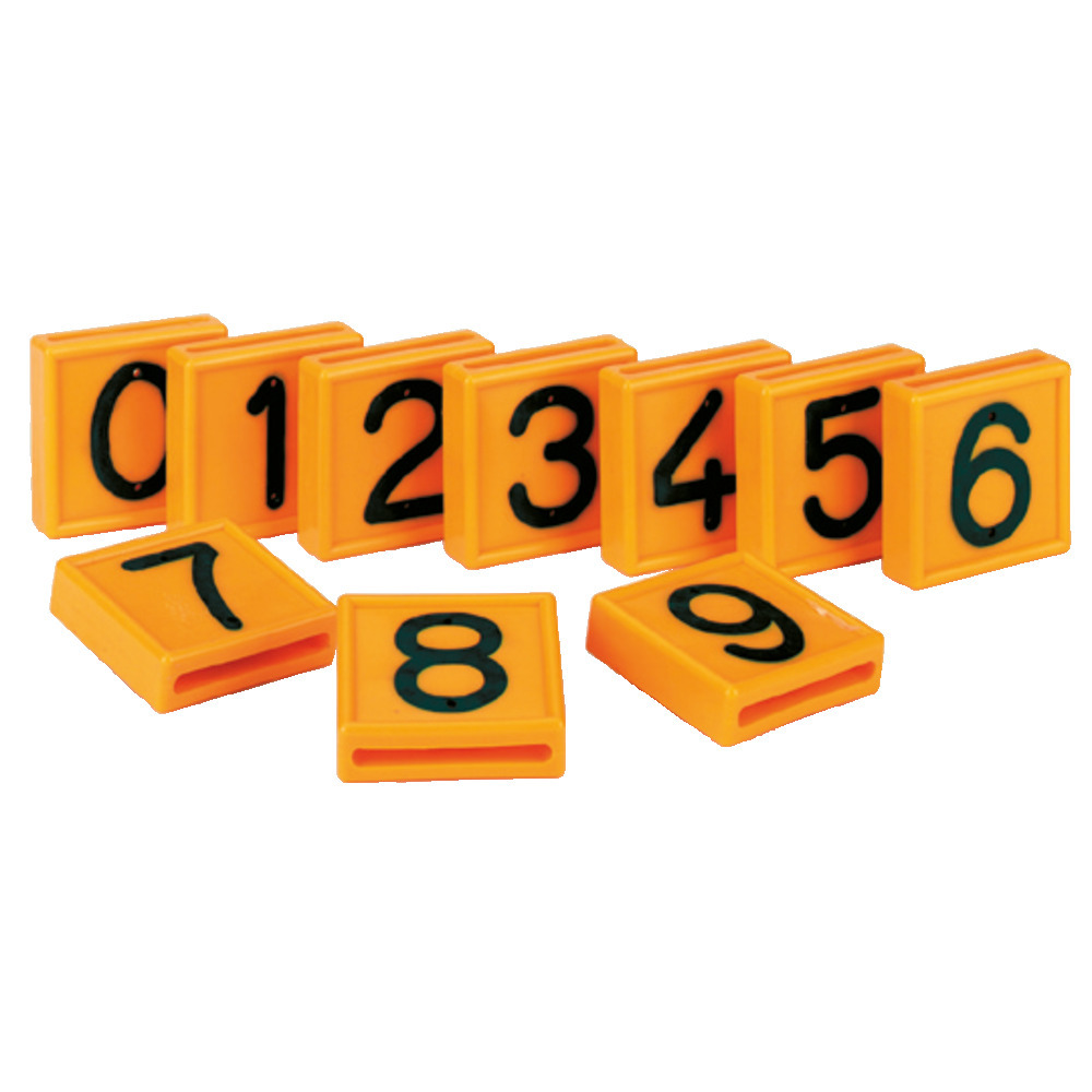 Einstelliger, gelber Nummernblock für Halsmarkierungsbänder aus Kunststoff. Zum Einschlaufen bei Halsbändern bis 40 mm Breite. 44 x 46 mm (HöhexBreite). 10er PackBest.Nr. 133001 bis 133009 = sortenrein (10 gleiche Nummern)Best.Nr. 133010 = Set von 0 bis 9