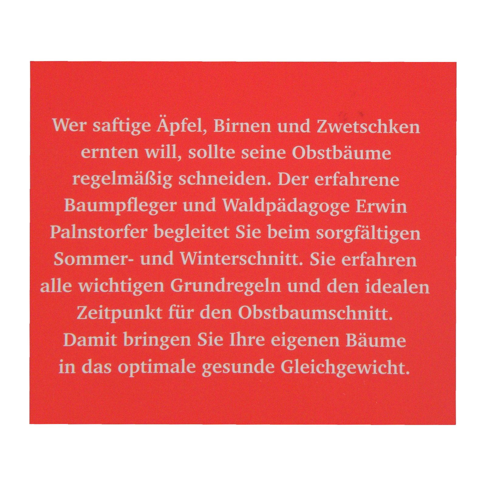 Wer saftige Äpfel, Birnen und Zwetschken ernten will, sollte seine Obstbäume regelmäßig schneiden.Der erfahrene Baumpfleger und Waldpädagoge Erwin Palnstorfer begleitet Sie beim sorgfältigen Sommer- und Winterschnitt.Sie erfahren alle wichtigen Grundregeln und den idealen Zeitpunkt für den Obstbaumschnitt.Damit bringen Sie Ihre eigenen Bäume in das optimale gesunde Gleichgewicht.Im Kleinformat, 64 Seiten.