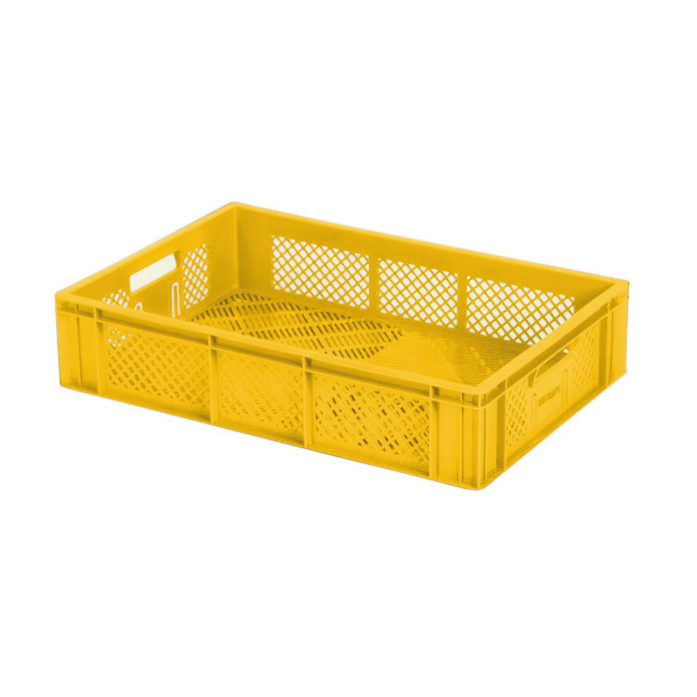 Angenehm zu tragen durch ergonomische, große Griffe. Wegen kleiner Durchbrüche auch für Haselnüsse und Walnüsse geeignet.Stapelfähige europalettengerechte Größen.Säure- und laugenunempfindlich.Geschmacks- und geruchsneutral.Lebensmittelecht.Kälte- und Hitzebeständig von -40° bis +80°C.UV-beständig. Farbe: gelb.Volumen ca. 35 Liter.Leergewicht 1.400 g. 600x400x170mm.