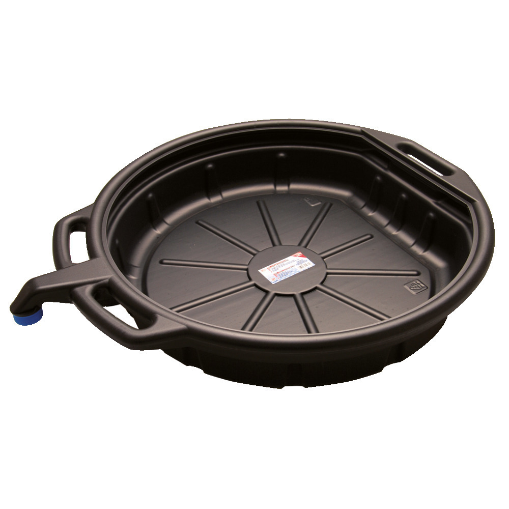 Ölauffangwanne mit 14 Litern Fassungsvermögen mit Ausgießer. Beständig gegen die meisten Lösungsmittel (bis 60°C), Säuren, Laugen, Alkohole, Öl und Benzin. Aus HPDE gefertigt, schlagfest, Ø 450 mm, Höhe 150 mm, Gewicht 1075 g.