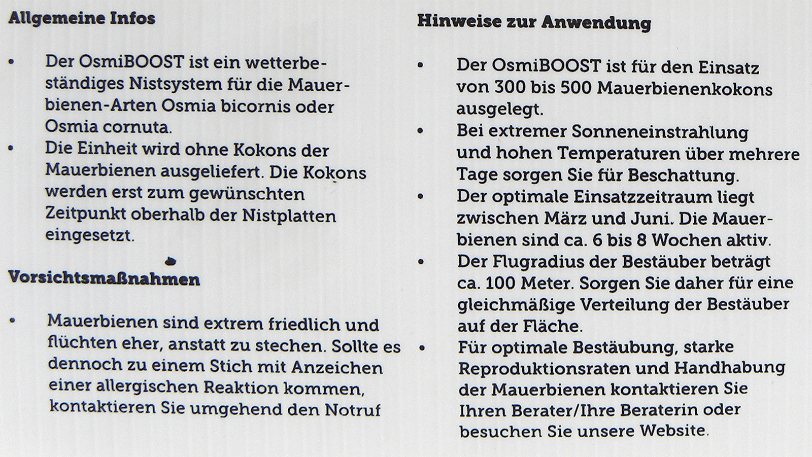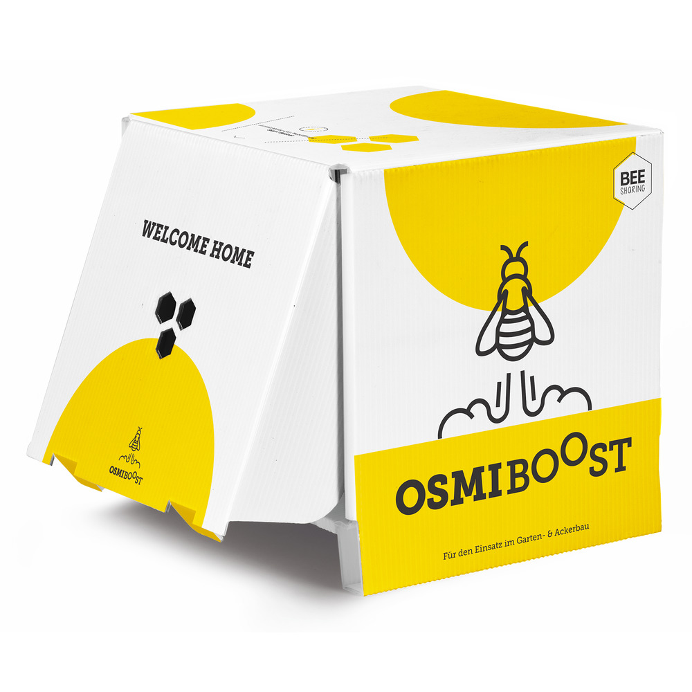 Der OsmiBOOST Niststand - für die effizienteste Bestäubung Ihrer Kulturen! Maße: 24 x 24 x 22,5 cmDer Niststand ist aus einer Kunststoff-Hohlkammerplatte gefaltet. Das Material ist leicht, stabil, bruchfest und beständig gegen Feuchtigkeit. Die gehörnte Mauerbiene (Osmia Cornuta) bevorzugt Nistgänge mit einem Durchmesser von 9 mm. Der Nistplattenstapel besteht aus 14 ineinander geschobene Kunststoff-Platten mit je 19 bzw. 20 Nistgänge. Maße: ca. 13,5 x 22 x 15 cm. Ausgelegt ist der Niststand für 300 bis 500 Mauerbienenkokons. Optimaler Einsatzzeitraum liegt zwischen März und Juni.OsmiBOOST ist geeignet für: