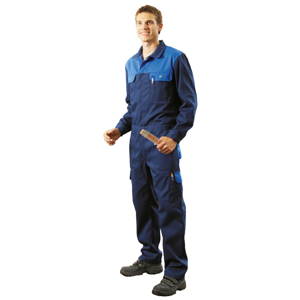 Modischer Overall aus hochwertigem 300g Mischgewebe (65% Polyester/35% Baumwolle). Mit vielen Taschen und Druck- oder Klettverschlüssen.Serienmäßig mit Handytasche, Bleistiftfächer und 2 Wege-Zipp. Größe 46-56.