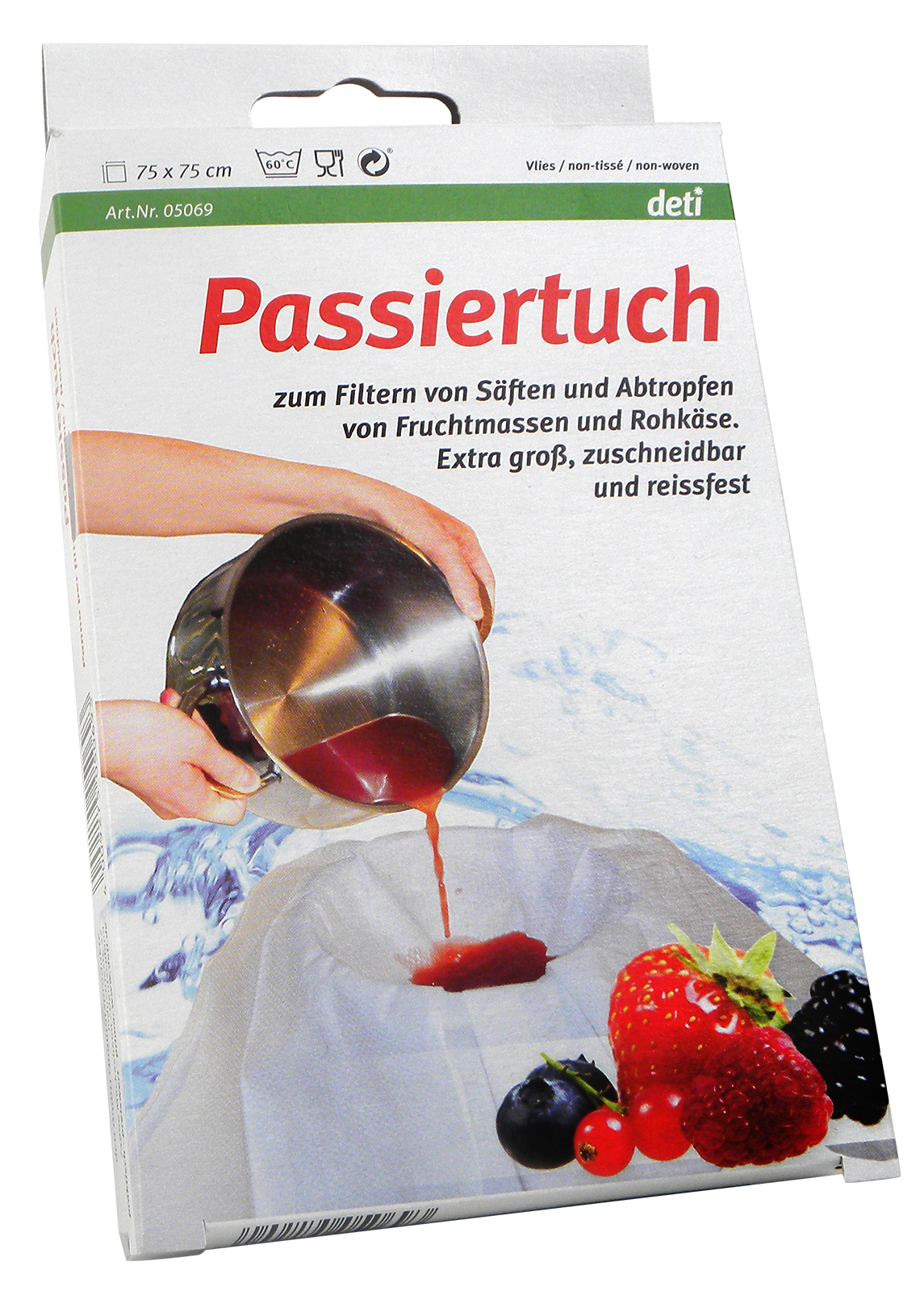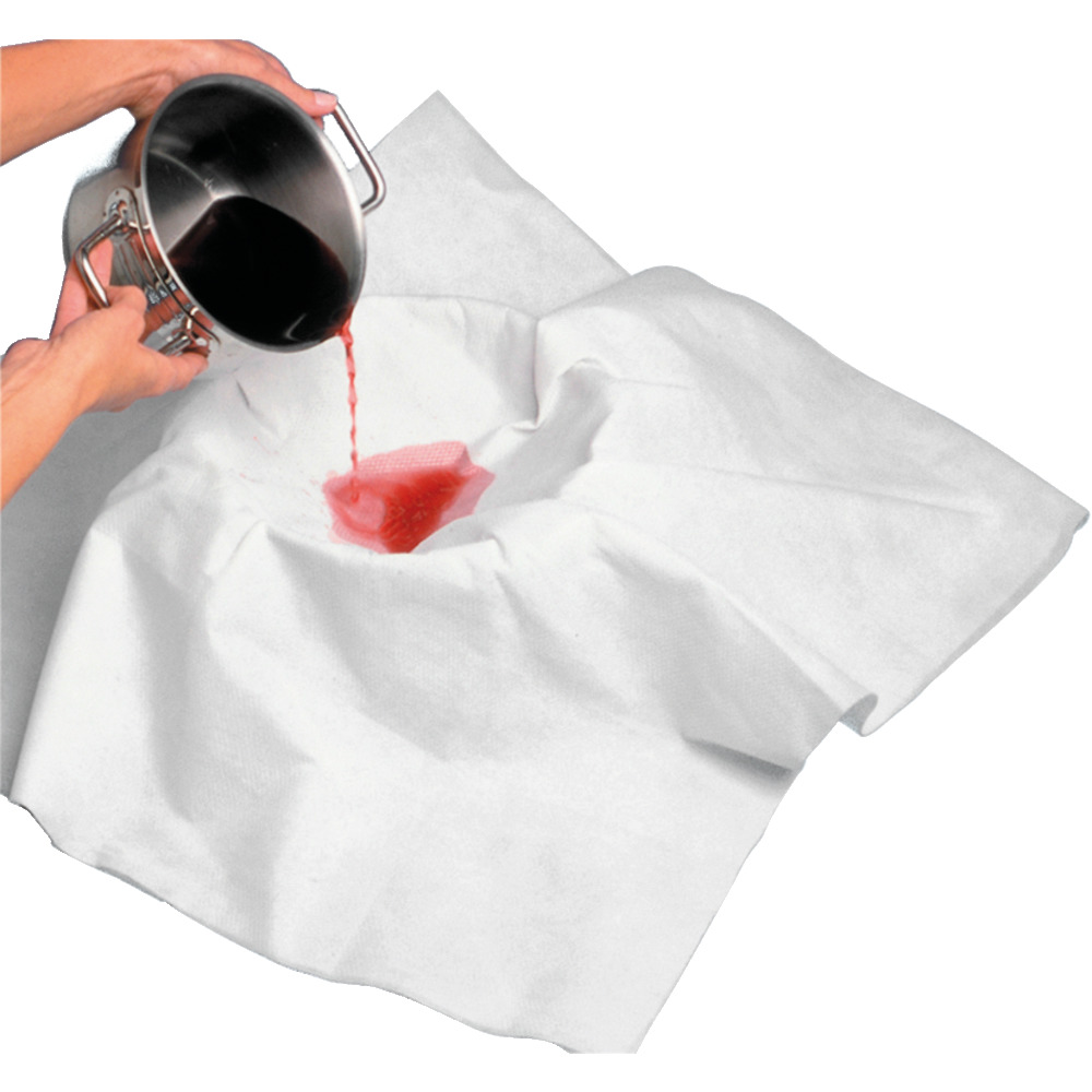 Das Passiertuch besteht aus einem extra feinmaschigen Spezialvlies, das beste Filtereigenschaften bietet. Es ist besonders hygienisch, da es es bei 60 °C in der Waschmaschine gereinigt werden kann. Farb- und Hygieneänderung nach dem Waschen und bei Mehrfachbenutzung möglich. Der Geschmack der Lebensmittel wird durch das Passiertuch nicht verändert. Es ist eine hygienische Alternative zu Baumwolle oder Leinen.