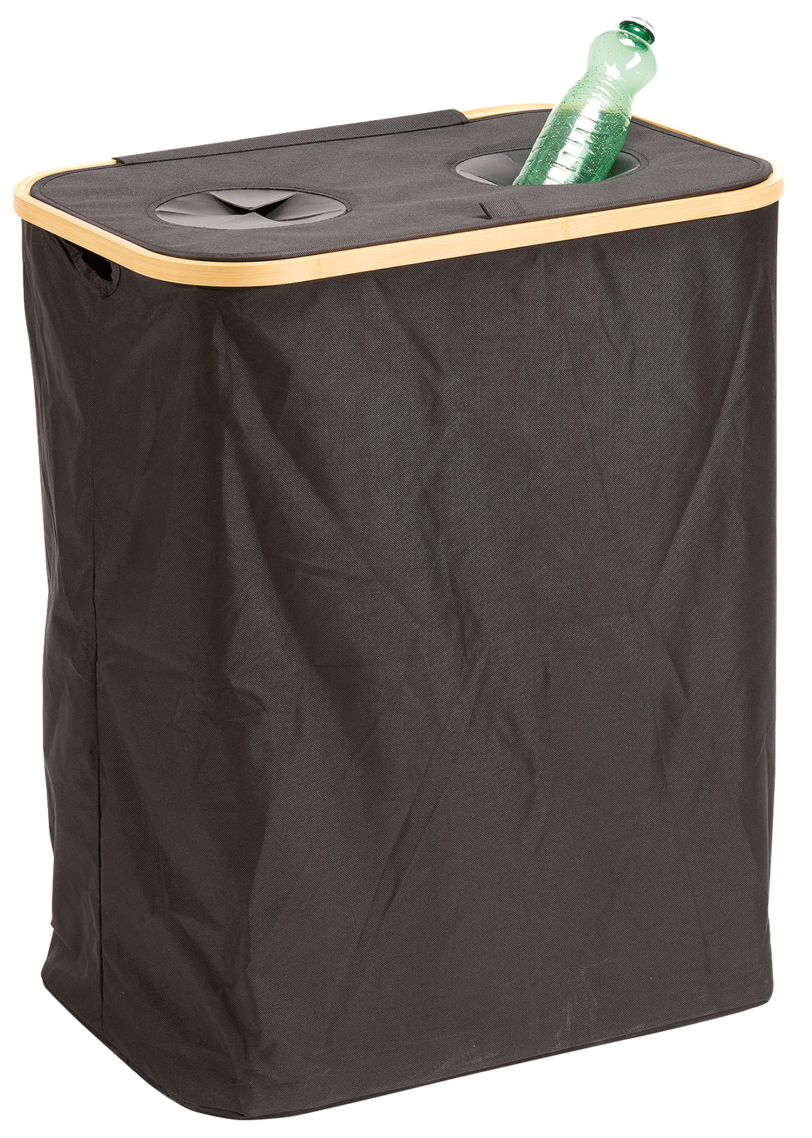 Pfandflaschenbehälter mit Deckel und Tragetaschen – stilvoll, hygienisch und durchdachtDieser Pfandflaschenbehälter vereint Funktionalität mit einem modernen Look: Die zwei strapazierfähigen Tragetaschen aus Polyester sind reißfest, wasserabweisend und leicht zu reinigen.Sie fassen zahlreiche leere Pfandflaschen – egal ob PET oder Glas – und machen Schluss mit dem Chaos in Haus, Garage oder auf dem Hof.Besonderes Highlight ist der Deckel aus Bambus. Er sorgt nicht nur für einen sauberen Abschluss, sondern verleiht dem Behälter auch ein natürliches und ansprechendes Design.Der Deckel verhindert Gerüche und schützt den Inhalt vor Insekten und Schmutz – ideal für den Einsatz in Küche, Vorratsraum oder auf dem Balkon.Die Tragetaschen lassen sich dank stabiler Tragegriffe einfach entnehmen und zum nächsten Rückgabeautomaten mitnehmen.Nach dem Leeren können sie platzsparend zusammengefaltet werden. Waschbar bis 40° C.Material: Taschen aus Polyester, Oxford 600 D Gewebe + Deckel aus BambusBesonderheiten: Abnehmbarer Deckel, Tragegriffe, leicht zu reinigenPerfekt für alle, die Pfandflaschen und Dosen praktisch sammeln und stilvoll verstauen wollen – ob zu Hause oder unterwegs.Maße: 57 x 37,50 x 67 cm