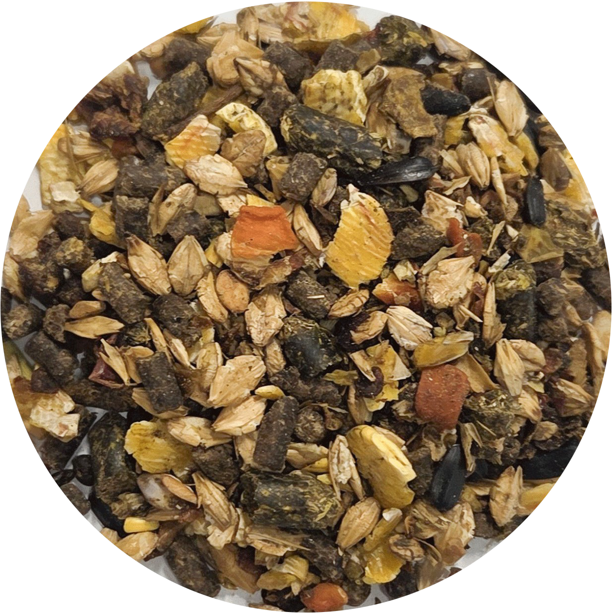 Gerstenflocken, Maisflocken, Grasgrünmehl, Apfeltrester, Leinsaat, Sojaflocken (getoastet), Weizenkleie, Sonnenblumenschrot, Sojaöl, Rübenmelasse, Sonnenblumensaat, Calciumcarbonat, Bierhefe, Natriumchlorid, Karottenflocken, Magnesiumoxid, Hagebuttenschalen, Rote Beete, Monocalciumphosphat, Brennnessel, Löwenzahn, Weißdornblätter, Birkenblätter, Himbeerblätter