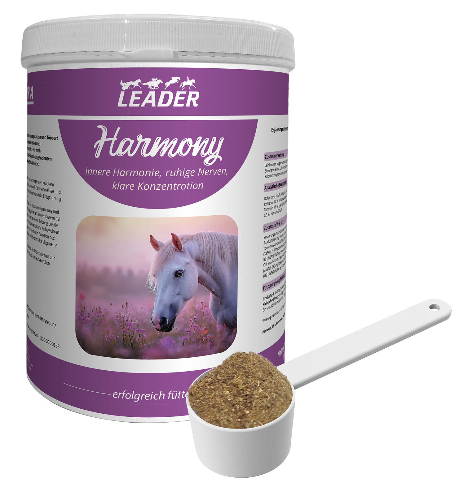 Für innere Balance und starke NervenLeader Harmony unterstützt dein Pferd dabei, auch in stressigen oder ungewohnten Situationen – wie Training, Transport oder Stallwechsel – ruhig, konzentriert und ausgeglichen zu bleiben.Mit einer wertvollen Kombination aus Magnesium, L-Tryptophan, B-Vitaminen sowie ausgewählten Kräutern wie Baldrian, Hopfen, Lavendel und Zitronenmelisse fördert Leader Harmony die innere Ruhe, Nervenstärke und das emotionale Gleichgewicht deines Pferdes.Vorteile auf einen Blick:Unterstützt Nervenstärke, Gelassenheit und KonzentrationIdeal bei Stress, Nervosität oder erhöhter AnspannungFördert das emotionale Gleichgewicht und die EntspannungMagnesium & B-Vitamine für eine normale NervenfunktionL-Tryptophan unterstützt die natürliche SerotoninbildungMit Kräutern für innere Ruhe und WohlbefindenAntioxidantien (Vitamin C & E) schützen die NervenzellenZusammensetzung:Leinkuchen, Magnesiumoxid, Apfeltrester, Bierhefe, Calciumcarbonat, Zitronenmelisse, Magnesiumcitrat, Baldrian, Hopfen, Lavendel, KamilleFütterungsempfehlung:Großpferd: 30-40 g (3-4 Messlöffel) pro TagKleinpferd/Pony: 10-20 g (1-2 Messlöffel) pro TagEin Messlöffel entspricht ca. 10 gWirkung meist sichtbar nach 5-10 TagenPulver unter das Kraftfutter mischen und leicht anfeuchten oder alternativ mit etwas Mash vermengen – erleichtert die Aufnahme und reduziert die Staubbildung.Hinweis: 48 h Karenzzeit bei Sportpferden.Inhaltsstoffe:Rohprotein 24,5 %Rohfaser 6,2 %Rohfett 4,2 %Rohasche 22,1 %Calcium 1,7 %Phosphor 0,4 %Magnesium 8,2 %Natrium 0,05 %Lysin 0,6 %Methionin 0,3 %Threonin 0,6 %Zusatzstoffe pro kg:Vitamin C 10000 mgVitamin E 2500 mgCholinchlorid 2100 mgVitamin B1 1080 mgVitamin B6 1000 mgNiacinamid 1000 mgCalcium-D- Pantothenat 1000 mgVitamin B2 880 mgFolsäure 85500 µgVitamin B12 10000 µgL-Tryptophan 110000 mg