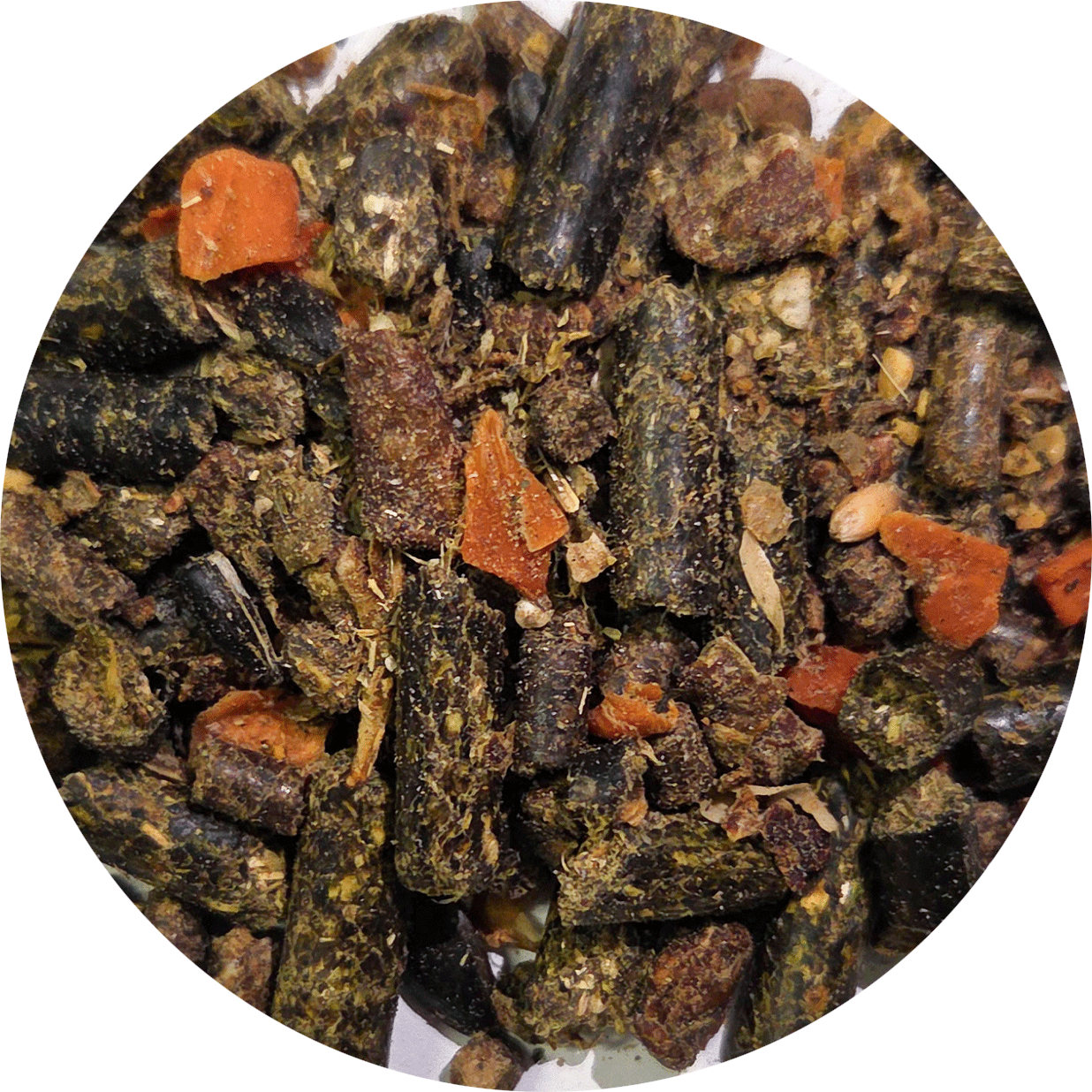 Grasgrünmehl, Apfeltrester, Sojaflocken (getoastet), Leinsaat, Sonnenblumensaat, Schwarzkümmelpresskuchen, Sonnenblumenschrot, Sojaöl, Calciumcarbonat, Karottenflocken, Bierhefe, Natriumchlorid, Hagebuttenschalen, Rote Beete, Magnesiumoxid, Brennnessel, Löwenzahn, Weißdornblätter, Birkenblätter, Himbeerblätter, Monocalciumphosphat;