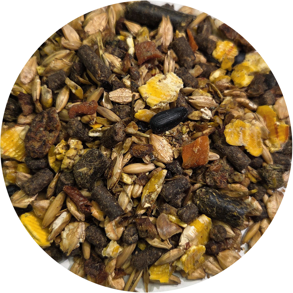 Gerstenflocken, Maisflocken, Apfeltrester, Hafer, Sojaflocken (getoastet), Leinsaat, Weizenkleie, Sonnenblumenschrot, Calciumcarbonat, Grasgrünmehl, Sojaöl, Rübenmelasse, Sonnenblumensaat, Bierhefe, Natriumchlorid, Karottenflocken, Monocalciumphosphat, Magnesiumoxid, Hagebuttenschalen, Rote Beete, Brennnessel, Löwenzahn, Weißdornblätter, Birkenblätter, Himbeerblätter