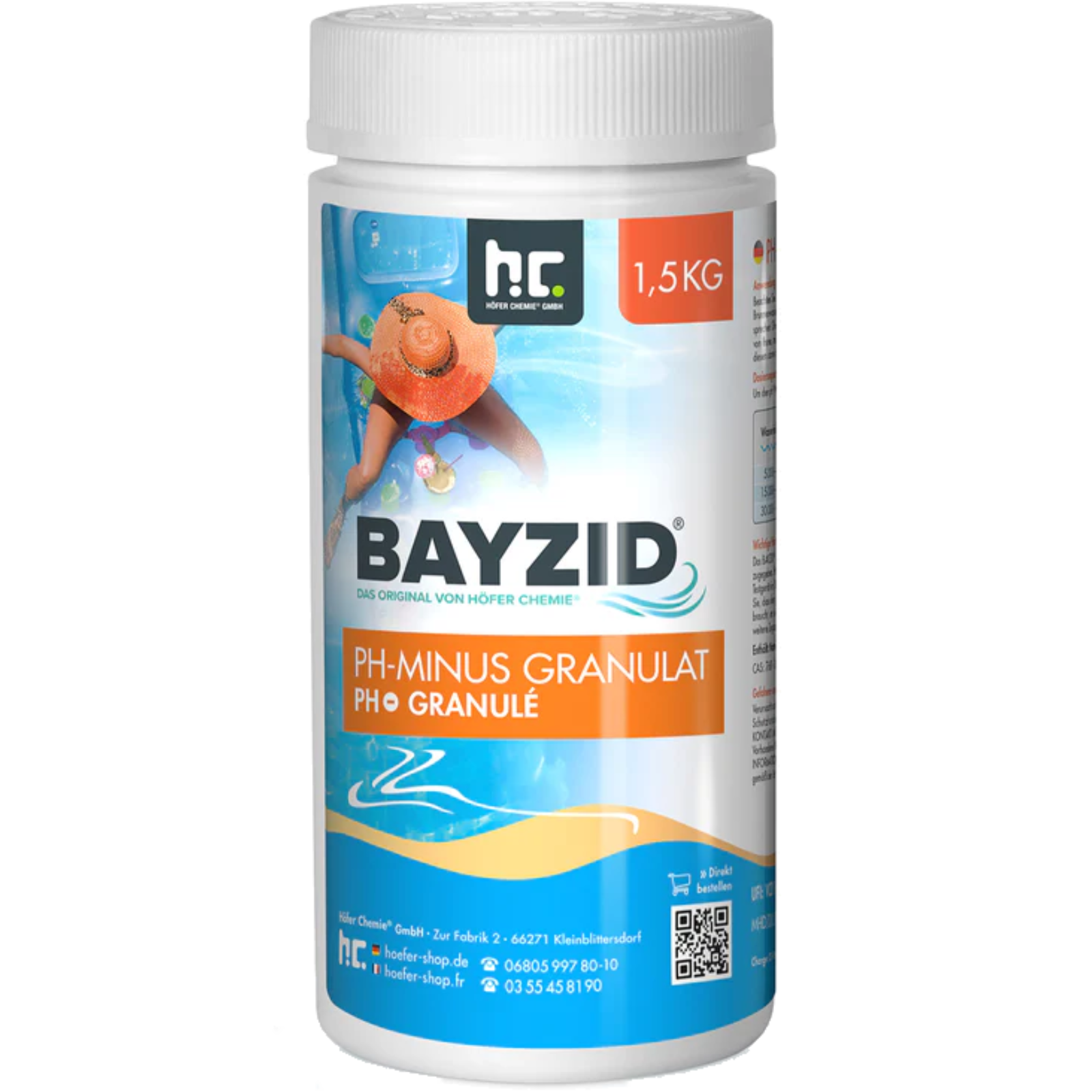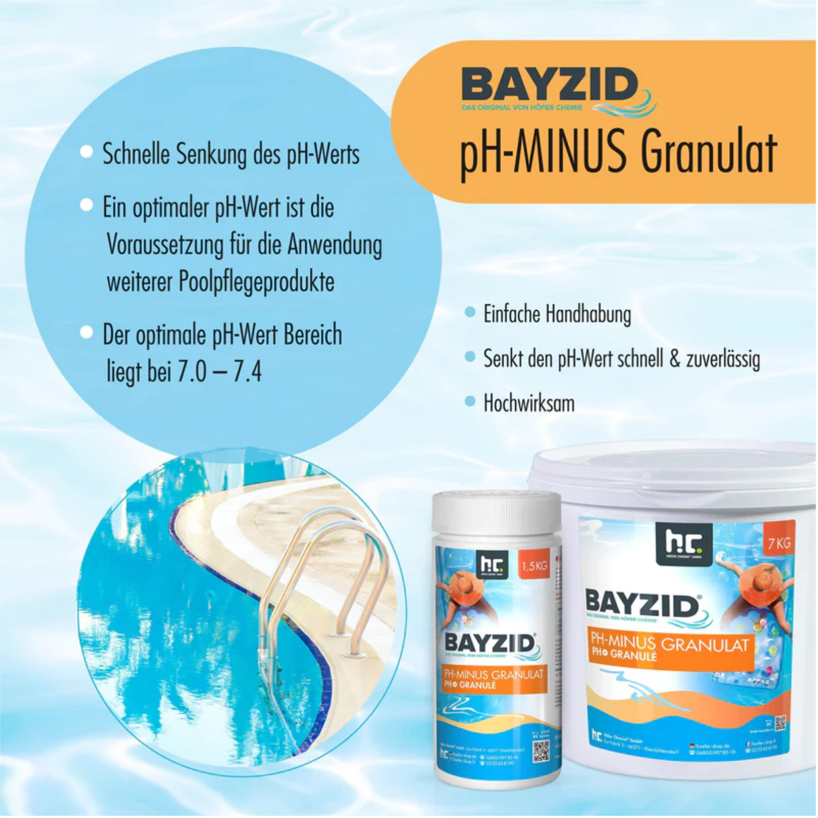BAYZID pH-Minus Granulat zur effektiven pH-Wert-Regulierung im PoolEgal ob Pool-Neuling oder erfahrener Schwimmbadbesitzer – die Kontrolle des pH-Werts ist für alle unverzichtbar. Ein unausgeglichener pH-Wert kann zahlreiche Probleme verursachen: von Kalkablagerungen über Algenbildung bis hin zu Hautreizungen. Darüber hinaus entfalten viele Poolpflegeprodukte ihre volle Wirkung nur bei einem optimalen pH-Wert. Das BAYZID pH-Minus Granulat hilft Ihnen zuverlässig dabei, den idealen pH-Bereich zu erreichen und schafft damit die Grundlage für eine wirkungsvolle und nachhaltige Poolpflege.Beachten Sie bitte, dass unsere Dosierungsempfehlung NUR für Trinkwasser gilt. Bei Brunnenwasser oder anderen Wässern können wir keine Dosierungsempfehlung aussprechen!Dosierempfehlung:Der pH-Wert Ihres Poolwassers sollte dauerhaft zwischen 7,0 und 7,4 liegen. Die Dosiermenge von Bayzid pH-Minus Granulat richtet sich nach dem von Ihnen, mittels eines geeigneten Messbestecks (Testgerät) ermittelnden pH-Wert, um diesen dann auf den Idealwert von 7,0 - 7,4 einzustellen.Unsere Anwendungsempfehlungen für pH Senker Granulat:Am Tag kann der pH Wert nicht um mehr als 0,3 - 0,5 verändert werden. Eine Anpassung sollte langsam über mehrere Tage erfolgen.Um den pH Wert um 0,1 zu senken, benötigt man erfahrungsgemäß bei: 5.000 - 10.000 Liter Wasserinhalt: 5 g pro 2.500 Liter15.000 - 25.000 Liter Wasserinhalt: 20 - 50 g pro 10.000 Liter30.000 - 50.000 Liter Wasserinhalt: 50 - 100 g pro 10.000 Liter1.000 L = 1 m³Beachten Sie, dass der pH-Wert nach der Zugabe von pH Senkenden und oder hebenden Mitteln bis zu 24 Stunden braucht, um sich im gesamten Wasser einzustellen! Vermeiden Sie daher unkontrollierte weitere Zugaben.Wir wird das pH Minus Granulat angewendet?Das Bayzid pH-Minus Granulat wird verteilt über die Wasseroberfläche dem Becken zugegeben. Das Granulat sinkt auf den Boden und löst sich auf. Es entstehen keine Flecken durch das Bayzid pH-Minus Granulat auf der Folie. Halten Sie den pH Wert durch regelmäßige Kontrolle mit einem geeigneten Messbesteck (Testgerät) im Blick. So können Sie frühzeitig auf Veränderungen reagieren!Gefahr ! H318: Verursacht schwere Augenschäden.Weitere Informationen:Kindersicherheitsverschluss: NeinLagerung: Frostgeschützt, im Original Gebinde, kühl und trocken lagernHaltbarkeit: 3 - 4 Jahre ab Kaufdatum