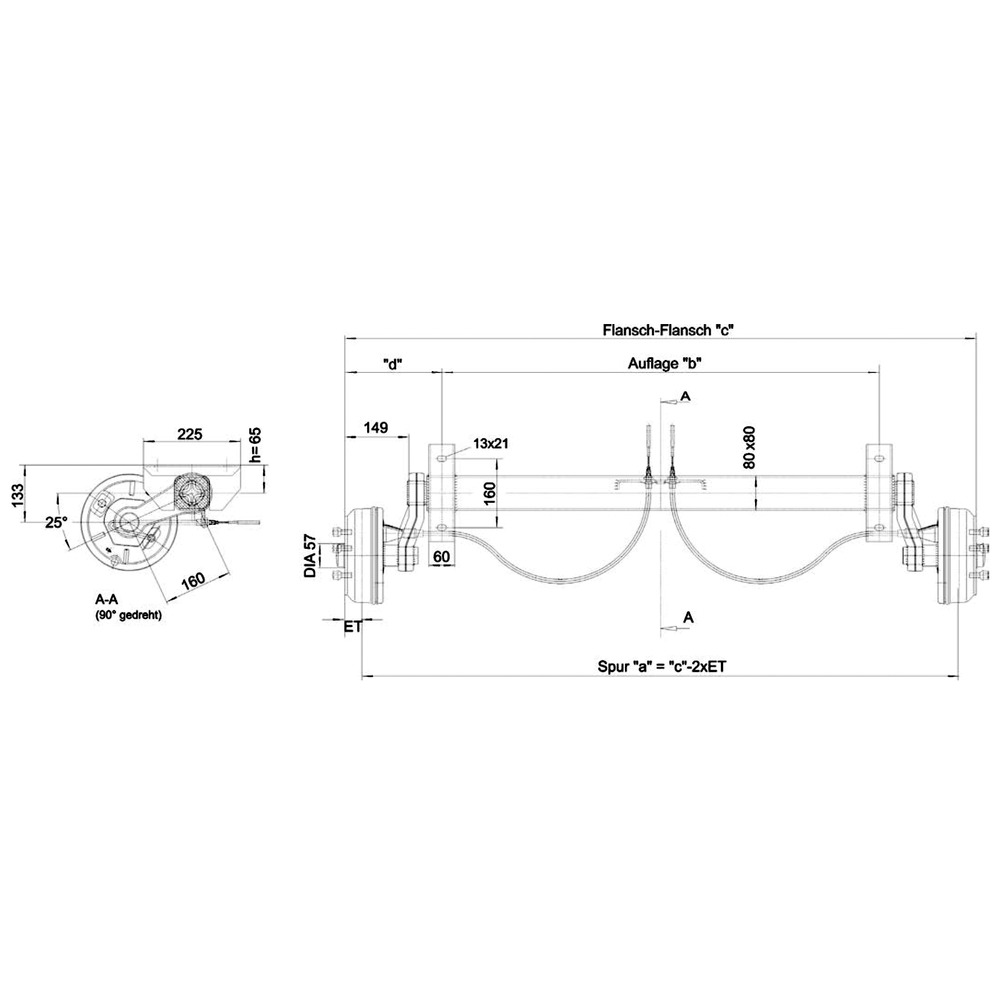 Mit Rückfahrautomatik, Achskörper feuerverzinkt, Geschwindigkeit bis 140 km/h, ET 25 bis 35, Spur a = c-2xET, inkl. Bremsseile, inkl. Radschrauben