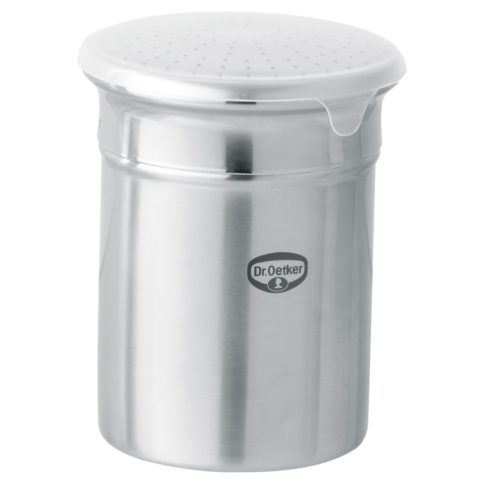 Küchenhelfer aus Edelstahl, zum dekorativen und schnellen Bestäuben, großes Füllvolumen, inklusive Schutzdeckel, Maße: Ø 7,5x9,5cm.