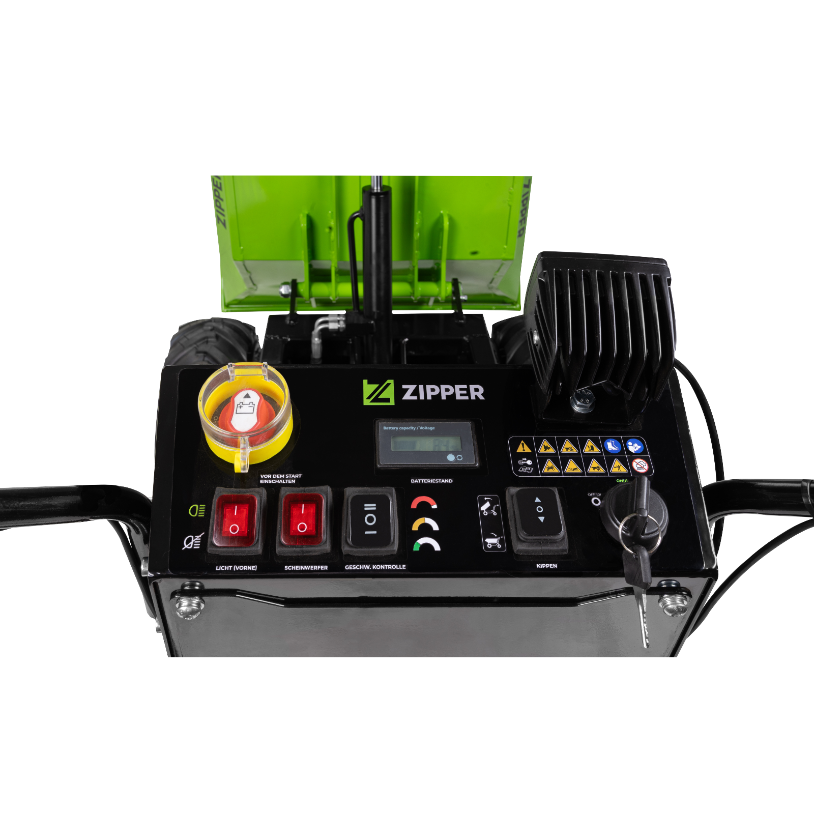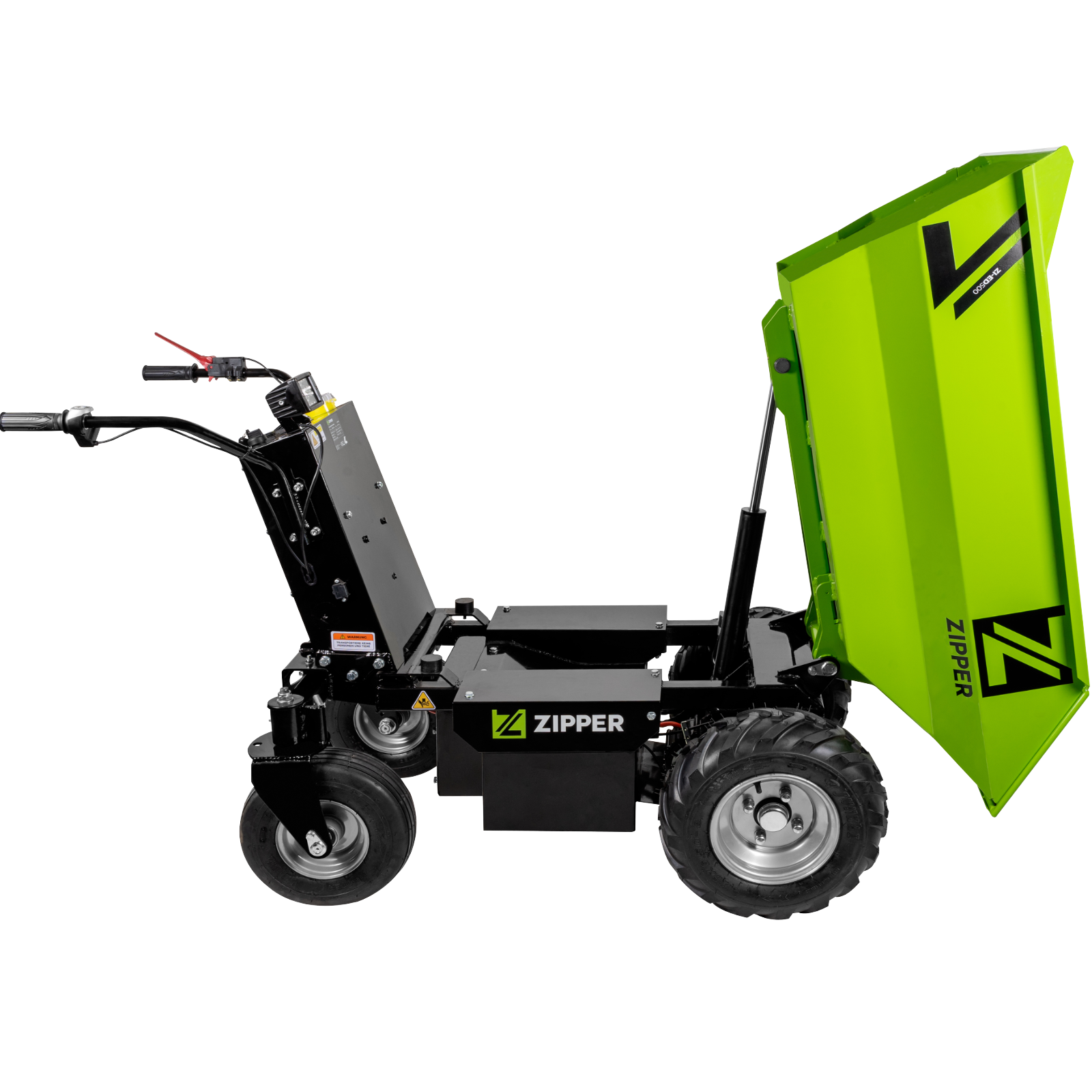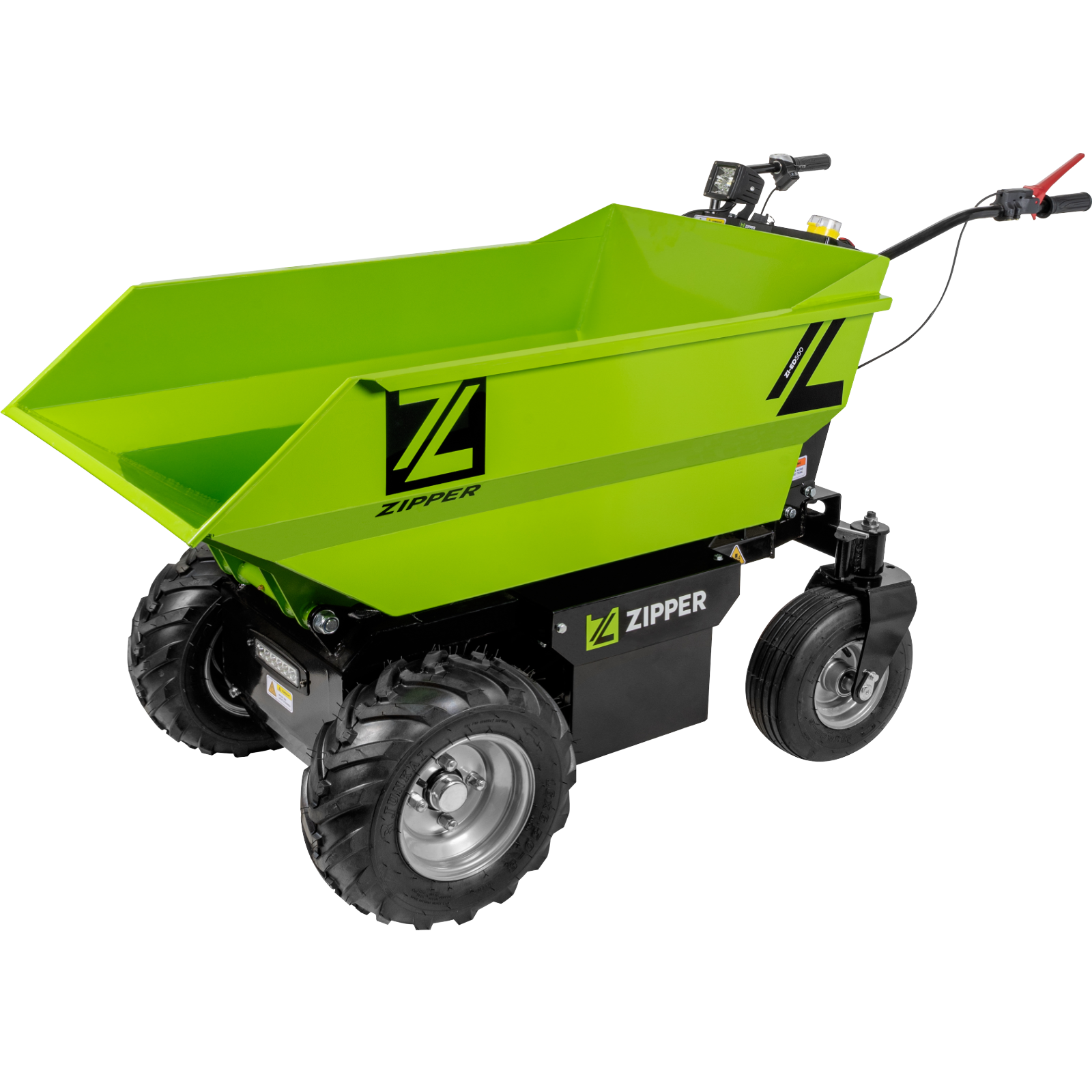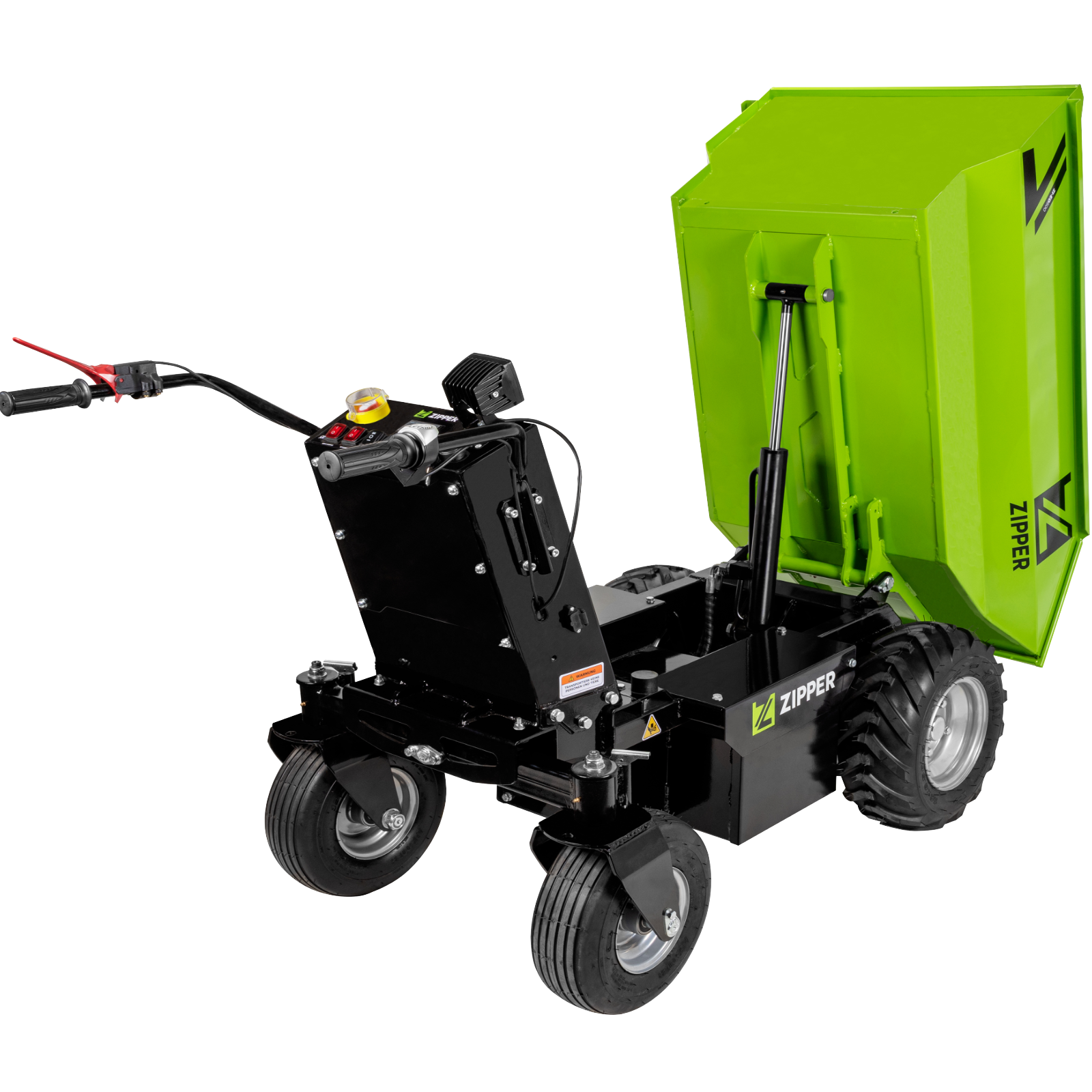 Stabiler Muldenaufbau mit 500 Kg Nutzlast und hydraulischen Kippzylinder. Maße: 1090 x 665 x 385 mm. 3 Vorwärtsgeschwindigkeiten 0 - 3,3 km/h, 0 - 4,2 km/h, 0 - 5 km/h und eine rückwärts 0 - 1,5 km/h. Ausgestattet mit LED-Scheinwerfer und Antriebsräder mit Traktionsprofil sowie stabilen Lenkrädern. Komplett mit Ladegerät und Akku.