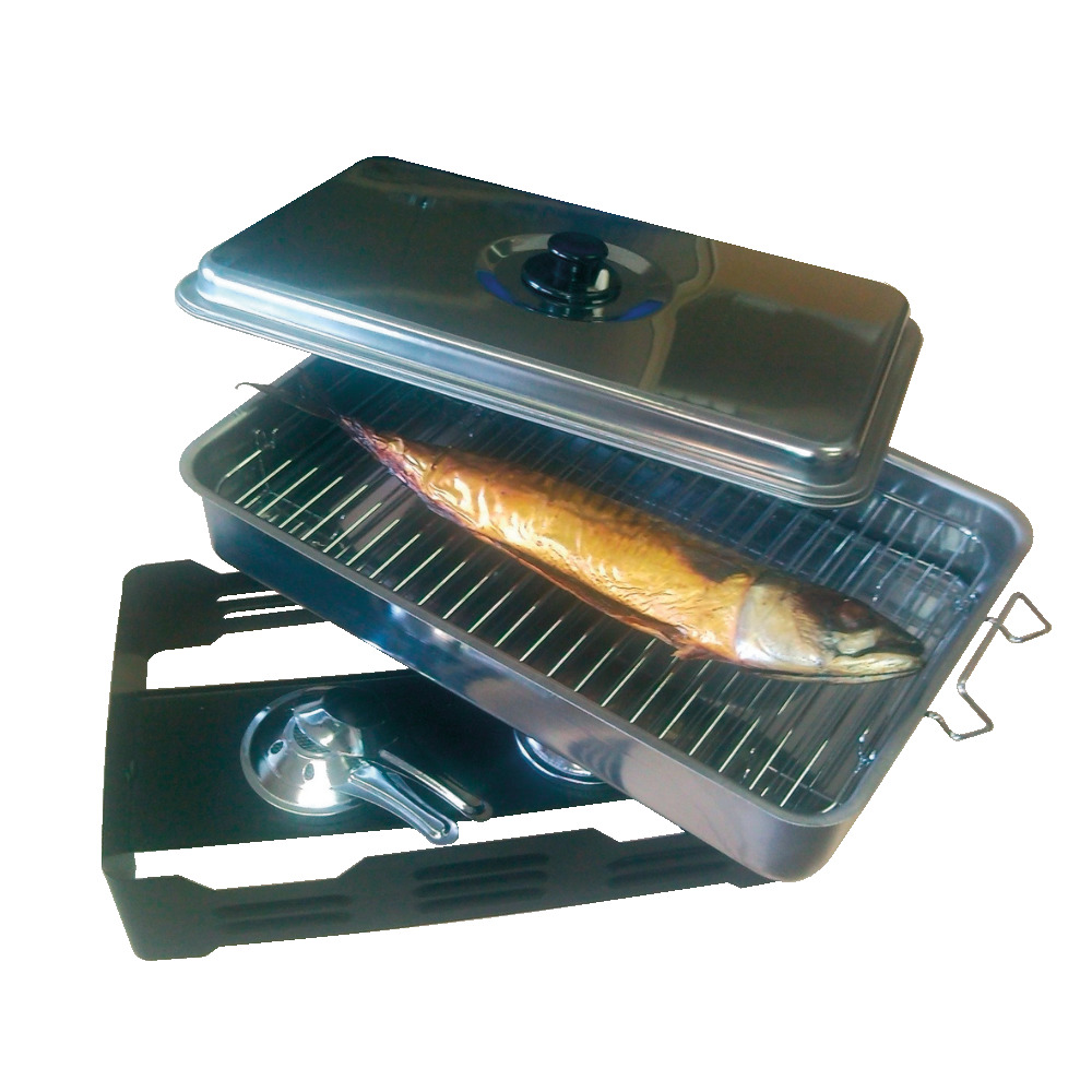 Erstklassiges Modell sowohl zum Räuchern als auch zum Grillen. 2 stabile verchromte Gitterroste (damit Sie die Fische 2-lagig räuchern können). Besonders groß: 42x26x12 cm zum Räuchern von 8 Forellen. Große Stahlplatte als Abdeckung über dem Räuchermehl (Tropfschutz). Eventuell gewünschter Rauchabzug kann am Deckel-Griff praktisch reguliert werden. 2 Fondue-Brenner sorgen für größtmögliche - aber regulierbare Hitze. 2 Deckel zum Löschen der Flammen werden mitgeliefert. Betrieb mit handelslüblicher Brennpaste.