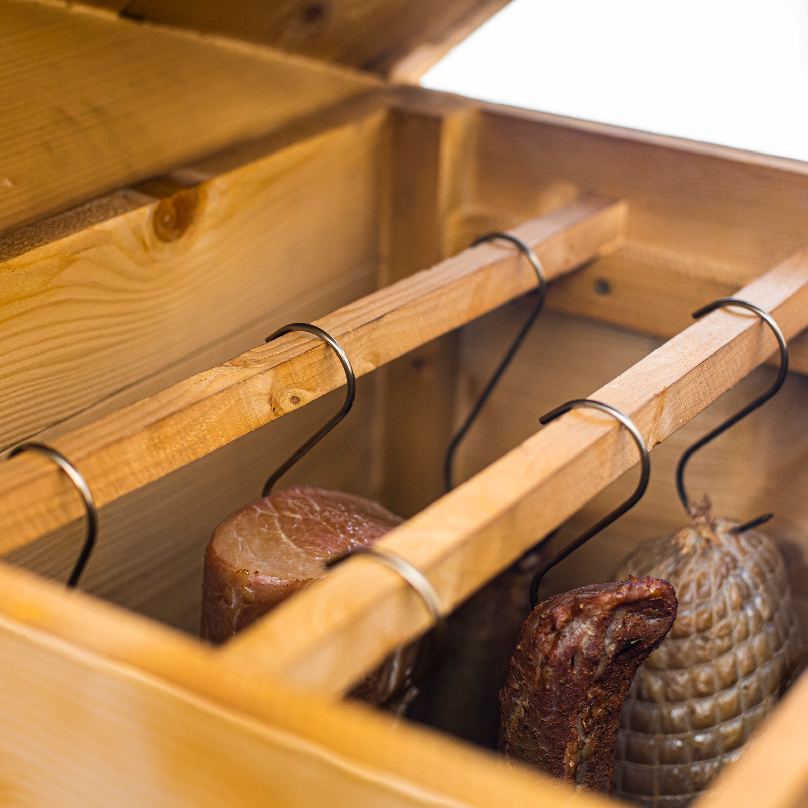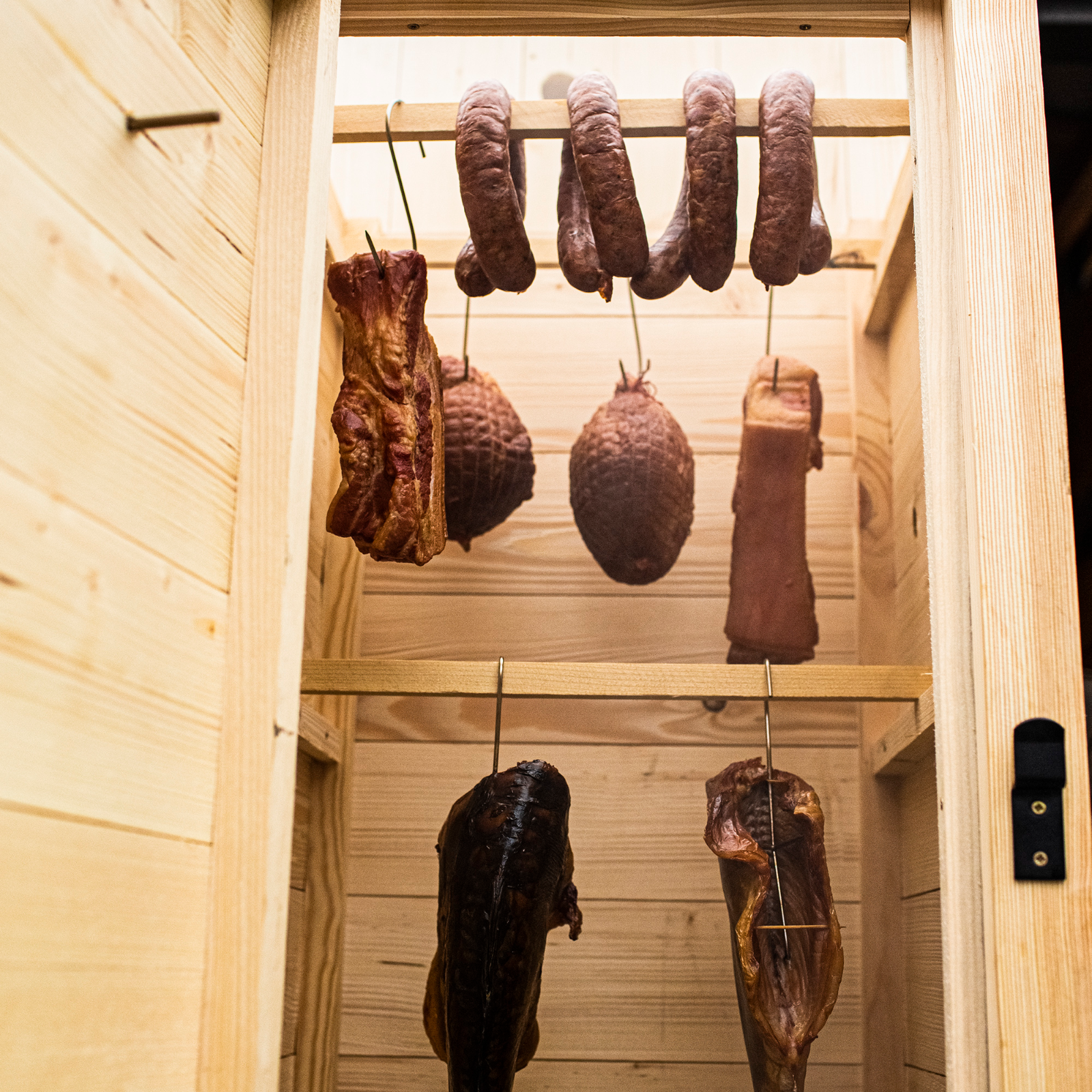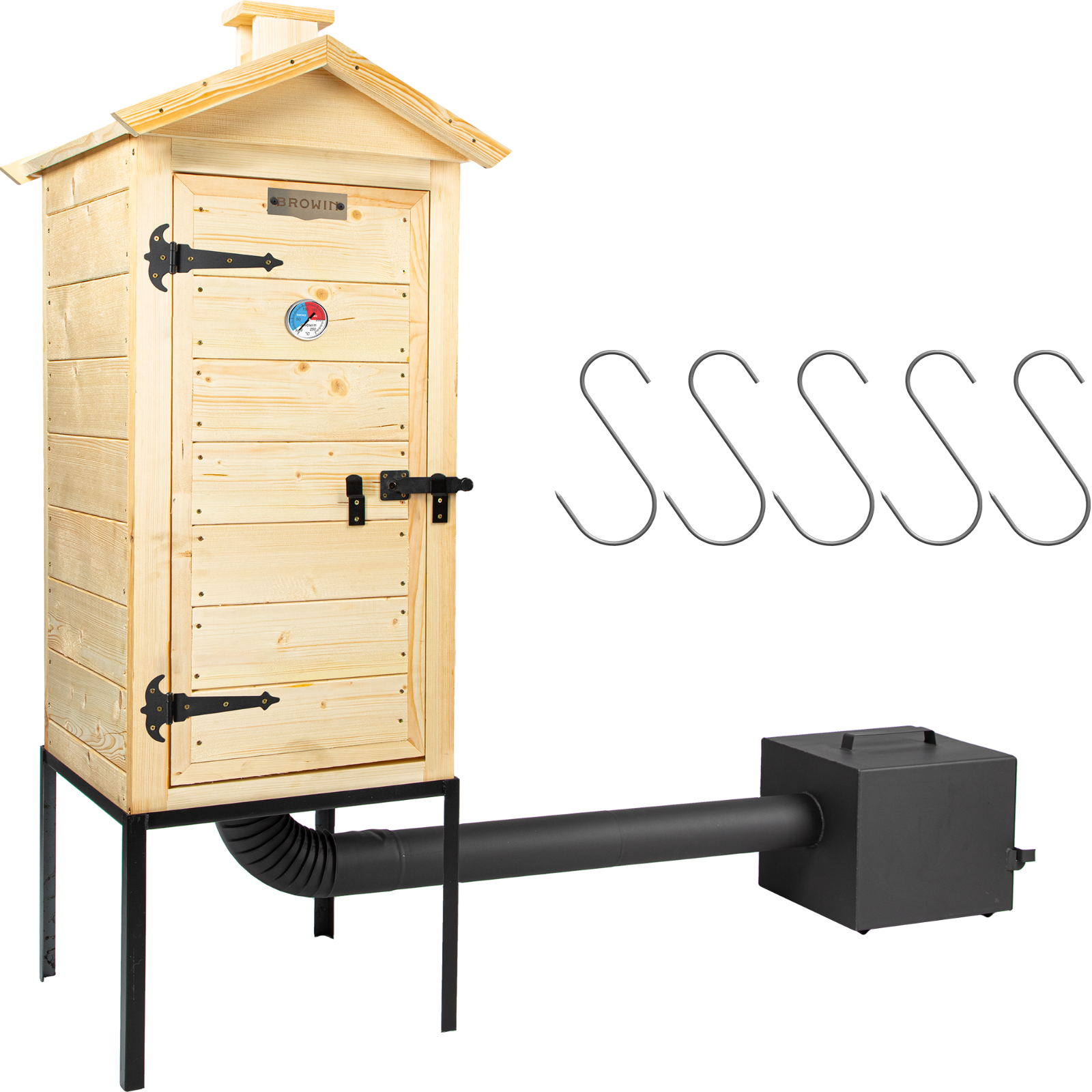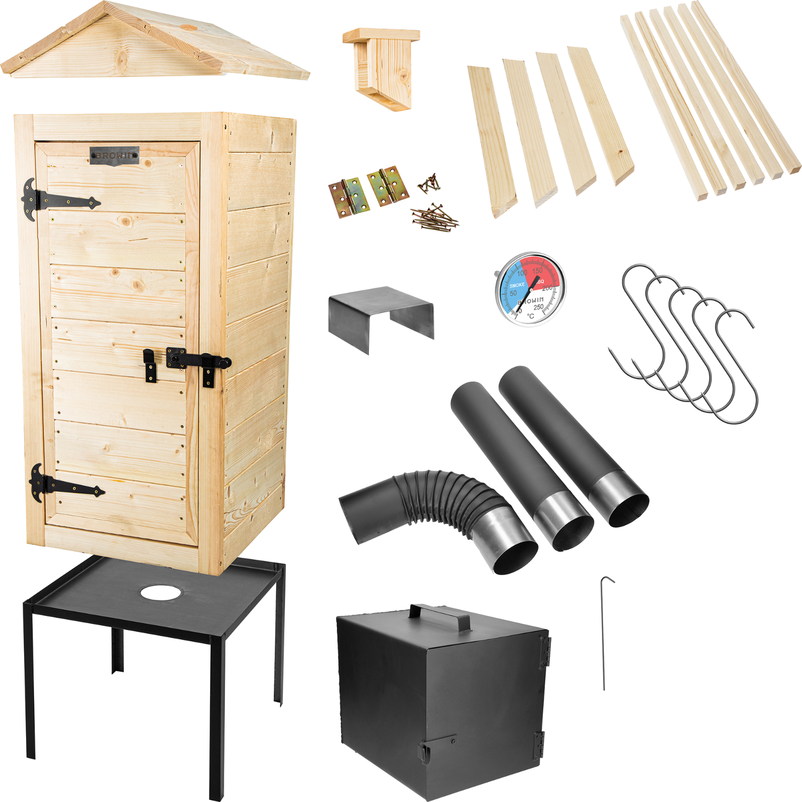 Dieser hochwertige Garten-Räucherofen aus Naturholz überzeugt mit einem stabilen Metall-Untersatz und einer anschließbaren Feuerstelle aus robustem Ofenblech.Dank der durchdachten Zusatz-Ausstattung bietet dieses vielseitige Set alles, was passionierte Räucherfreunde benötigen.Seine natürliche Optik fügt sich harmonisch in jeden Haus- oder Schrebergarten ein und macht ihn zur idealen Wahl für alle, die Wert auf Qualität und ein authentisches Räuchererlebnis legen.Zu den Vorzügen dieses Räucherofens gehören seine Eignung für verschiedene Räuchermethoden und seine robuste Konstruktion aus ausgewähltem, geschliffenem Naturholz.Die Räucherkammer ist aus Fichtenbrettern gefertigt. Das sich öffnende Dach ist an Scharnieren befestigt, so dass die Einlage sehr einfach im Räucherofen platziert werden kann.Der Zugang zum Räucherofen sowohl durch die Tür als auch durch das Dach ist eine sehr praktische und bequeme Lösung.Aufgrund der Höhe der Kammer eignet er sich ideal für das Räuchern langer Würste und langer Fische.An die Kammer wurde ein Metalluntersatz mit Füßen angepasst, und die Rauchquelle ist eine von unten anzuschließende große seitliche Feuerstelle aus starkem Ofenblech, mit einem zweistufigen Luftzirkulationssystem.Die Konstruktion der Kammer wurde mit dicken Querbalken verstärkt. Die Tür des Räucherofens wurde an soliden, pulverbeschichteten Scharnieren befestigt.Der abnehmbare Deflektor sorgt dafür, dass sich Hitze und Rauch während des Räuchervorgangs gleichmäßig verteilen.Die Art und Weise der Montage des Räucherofens, Sicherheitsempfehlungen für den Gebrauch und nützliche Tipps sind in der Anleitung enthalten, die im Set enthalten istIm Set sind enthalten:RäucherkammerAußenabmessungen der Räucherkammer aus Holz: 50 x 50 x 100 cm - ohne DachAbmessungen des Dachs mit Schornstein: 53 x 58 x 28,5 cmBretter: aus Fichte, mit einer Stärke von ca. 2 cmim Set enthalten: Räucherthermometer, 6 Balken für das Aufhängen von Produkten, 5 RäucherhakenUntersatz der Räucherkammer: aus Stahl 50 x 50 x 40 cmFeuerstelle und VerbindungselementeAußenabmessungen: 30 x 30 x 35 cmDurchmesser des Rohrstutzens: ca. 10 cm2 Stahlrohre: 0,5 m und ca. 10 cmRohrbogen: 90 Grad, ca. 10 cmdie Elemente des Sets sind mit hitzebeständiger Farbe beschichtetdie Feuerstelle ist aus starkem Ofenblech gefertigt – ca. 1,5 mmdie Tür der Feuerstelle ist mit einem zweistufigen Luftzirkulationssystem ausgestattetMaße: L x B x H: 50 x 50 x 150 cmGewicht: ca. 52 kg