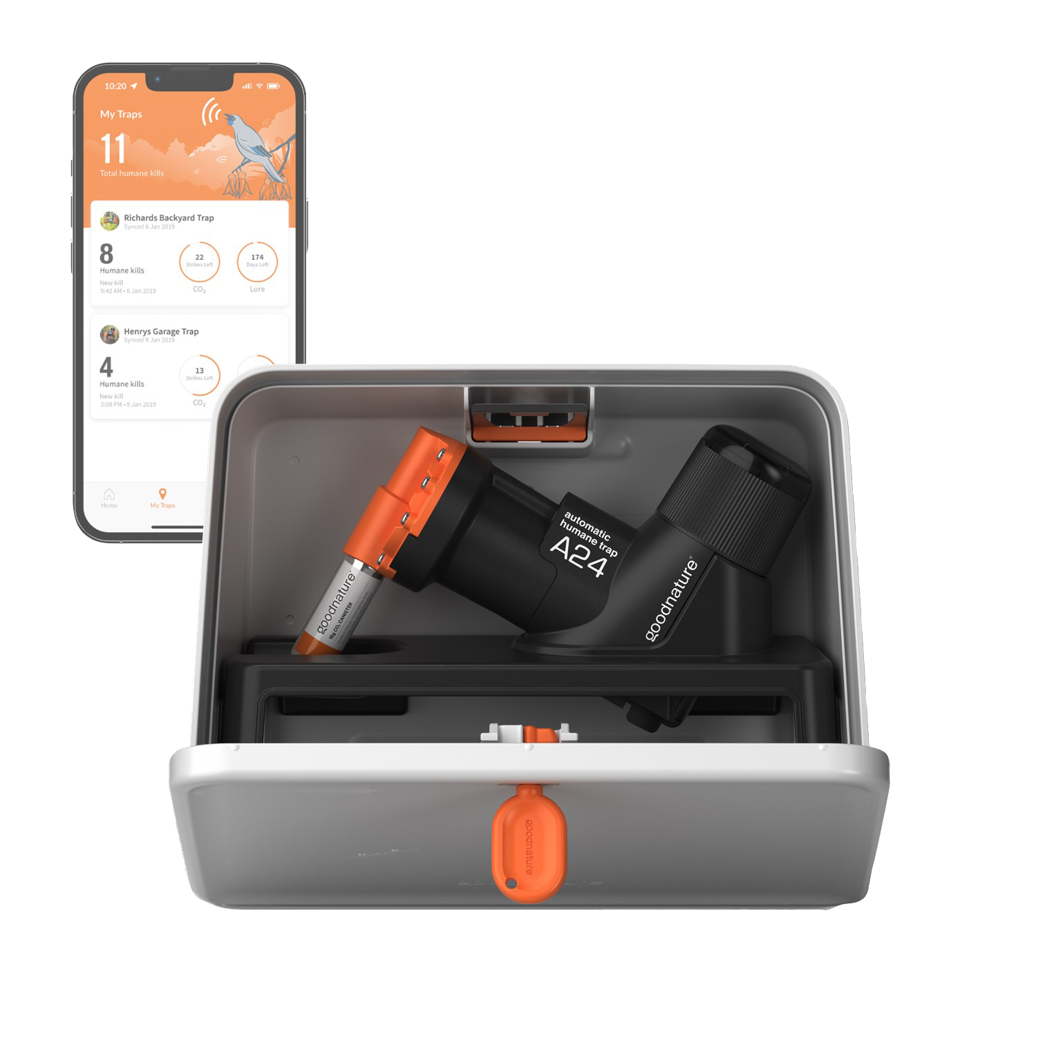 Das Profi-Fallenkit von Goodnature ist eine giftfreie Falle, die Ratten und Mäuse schnell und schmerzlos bekämpft. Diese Falle kann sowohl im Innen- als auch im Außenbereich verwendet werden. Nachdem die Falle ausgelöst wurde, fällt der Schädling runter und die Falle ist automatisch 24x bereit mit einer CO2-Patrone. So können Sie mehrere Ratten oder Mäuse fangen, ohne die Falle zurücksetzen zu müssen. Über die kostenlose Goodnature App können Sie sehen, wie oft die Falle ausgelöst wurde und wann die CO2-Patrone und der Lockstoff ausgetauscht werden müssen. Sie können auch eine Benachrichtigung erhalten, wenn die Falle ausgelöst wurde. In der App können Sie mehrere Fallen verwalten. Damit entfällt die Notwendigkeit, jede Falle täglich visuell zu überprüfen. Das Kit enthält eine robuste Box, in der die Falle und die toten Nagetiere außer Sicht und außerhalb der Reichweite neugieriger Haustiere und Kinder aufbewahrt werden und die mit einem Schlüssel verschlossen wird. Die Box kann an eine Wand geschraubt werden. Das macht dieses Kit zu einer sehr sicheren und diskreten Lösung mit minimalem Diebstahlrisiko. Außerdem enthält das Kit eine zusätzliche CO2-Patrone, 2 gefüllte Lockstoff-Pumpen, eine Schale, in der die toten Tiere aufgefangen werden, und eine Halterung, um die Falle selbst an einem Baum, einer Wand oder einem anderen stehenden Objekt zu befestigen.