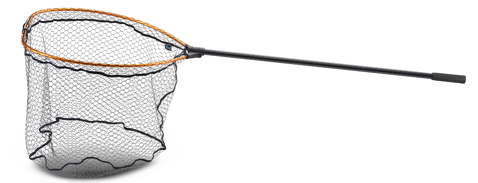 Ein großer Kescher der wenig Platz braucht, mit gummiertem Netz und Klappmechanismus, Netztiefe 65 cm, Transportlänge 120 cm.