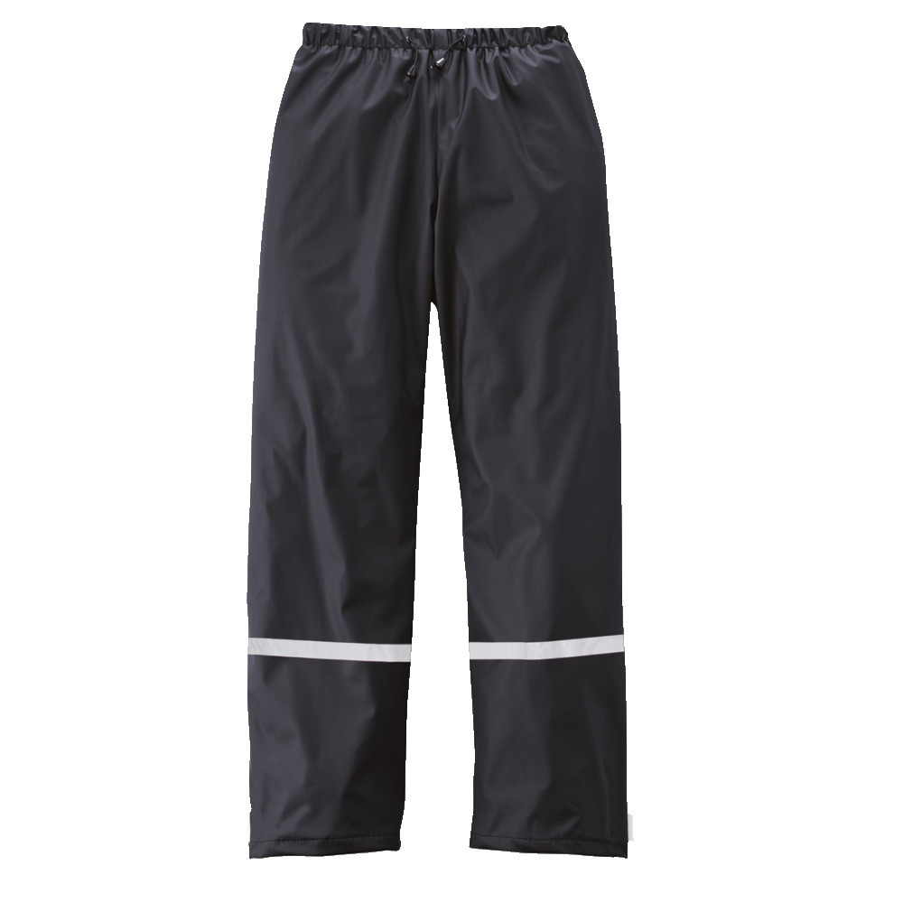 Elastische Regenhose mit PU-Beschichtung (180 g/m2), wasserdicht (3.000 mm), winddicht, regulierbarer Bund mit Gummizug, Beinweite durch Reißverschluss regulierbar, Reflektoren für zusätzliche Sicherheit. Material: 100% Polyester. Größe: S-3XL.
