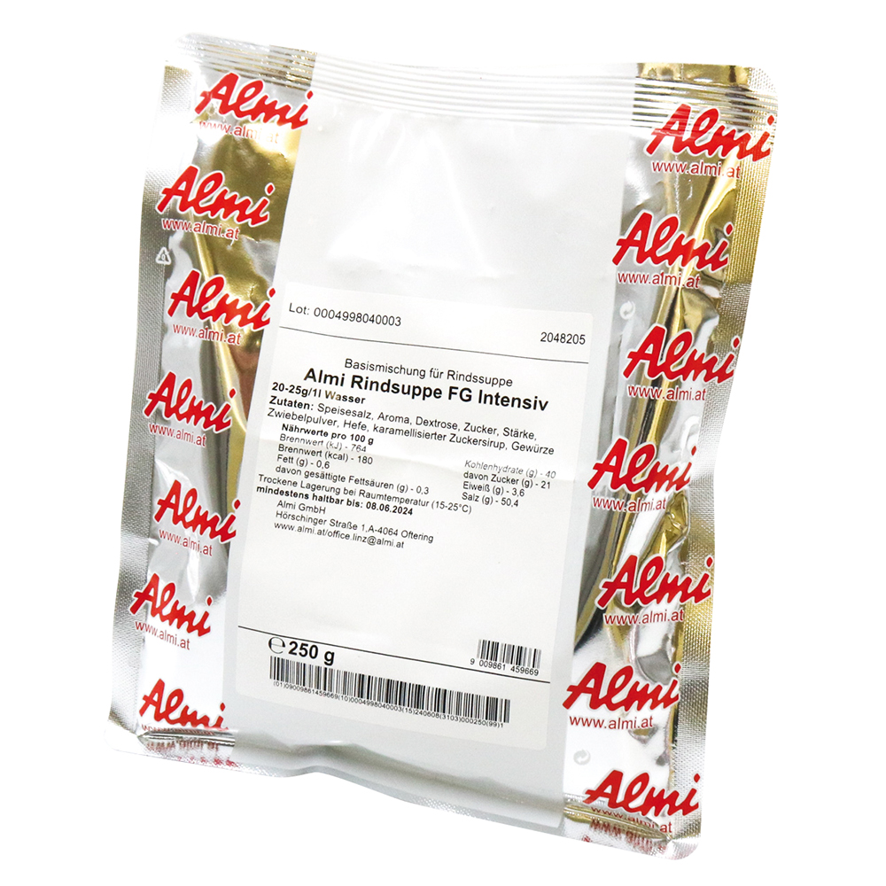 Fertigmischung für intensive Fleischbrühe. Inhalt 250 g. Zugabeempfehlung 20-25 g / 1.000 ml Wasser.