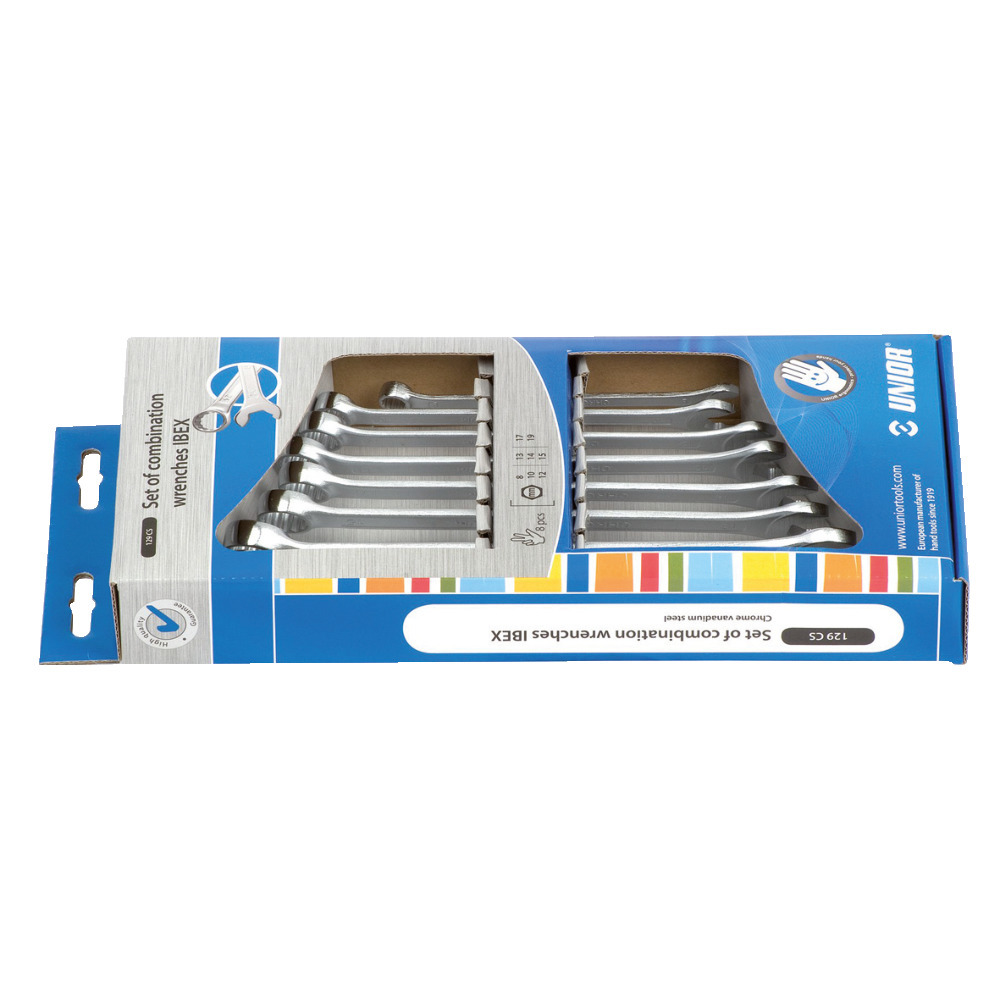 Innovativer Unior Schlüsselsatz mit IBEX-Ring-Gabelschlüssel ermöglicht eine „Ratschenfunkion“ mit den Gabelschlüssel. Ideal für schwer zugängliche Stellen und handliches Arbeiten. Inhalt: 8, 10, 12, 13, 14, 15, 17 und 19 mm.