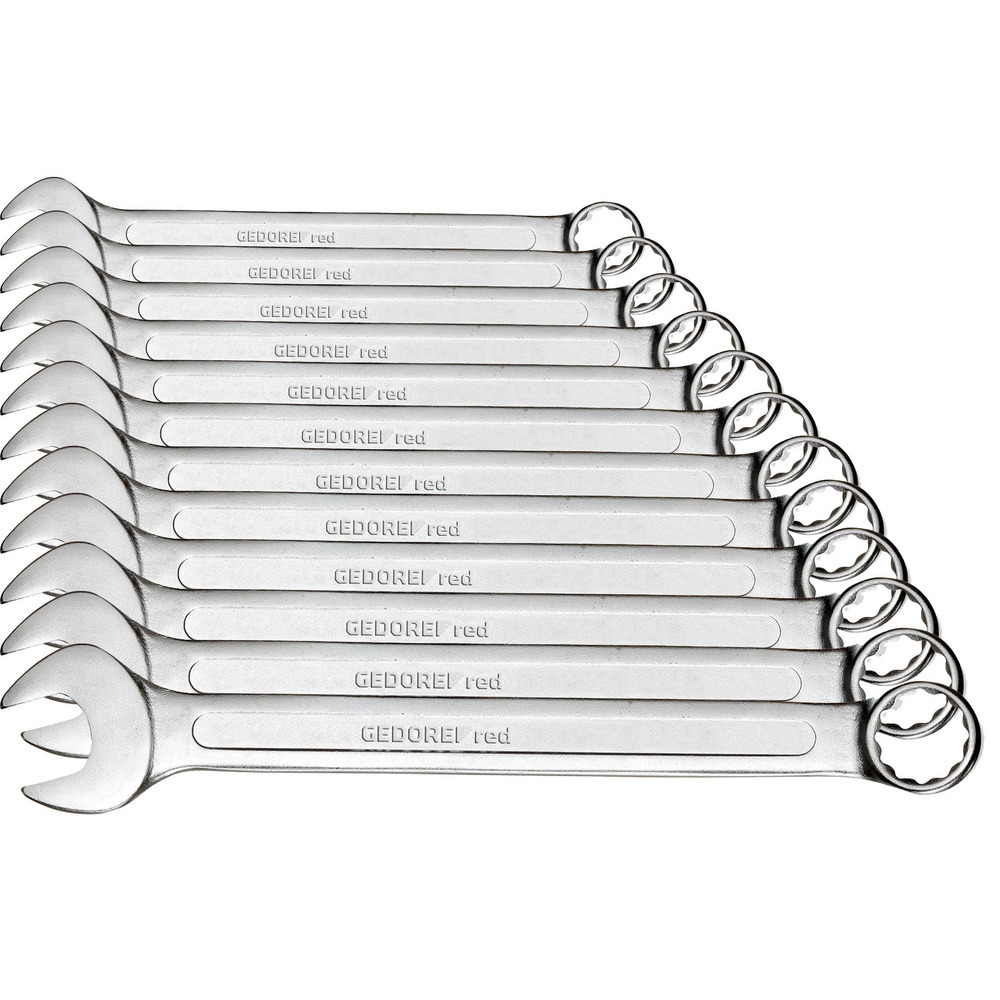 Ausführung nach DIN 3113, Form A, ISO 3318, ISO 7738. Ringseite abgewinkelt 15°. Maulstellung 15°. Oberfläche matt-satiniert verchromt. Chrom-Vanadium-Stahl. Im Halter.Inhalt: 10,11,12,13,14,17,19,22,24,27,30,32 mm.