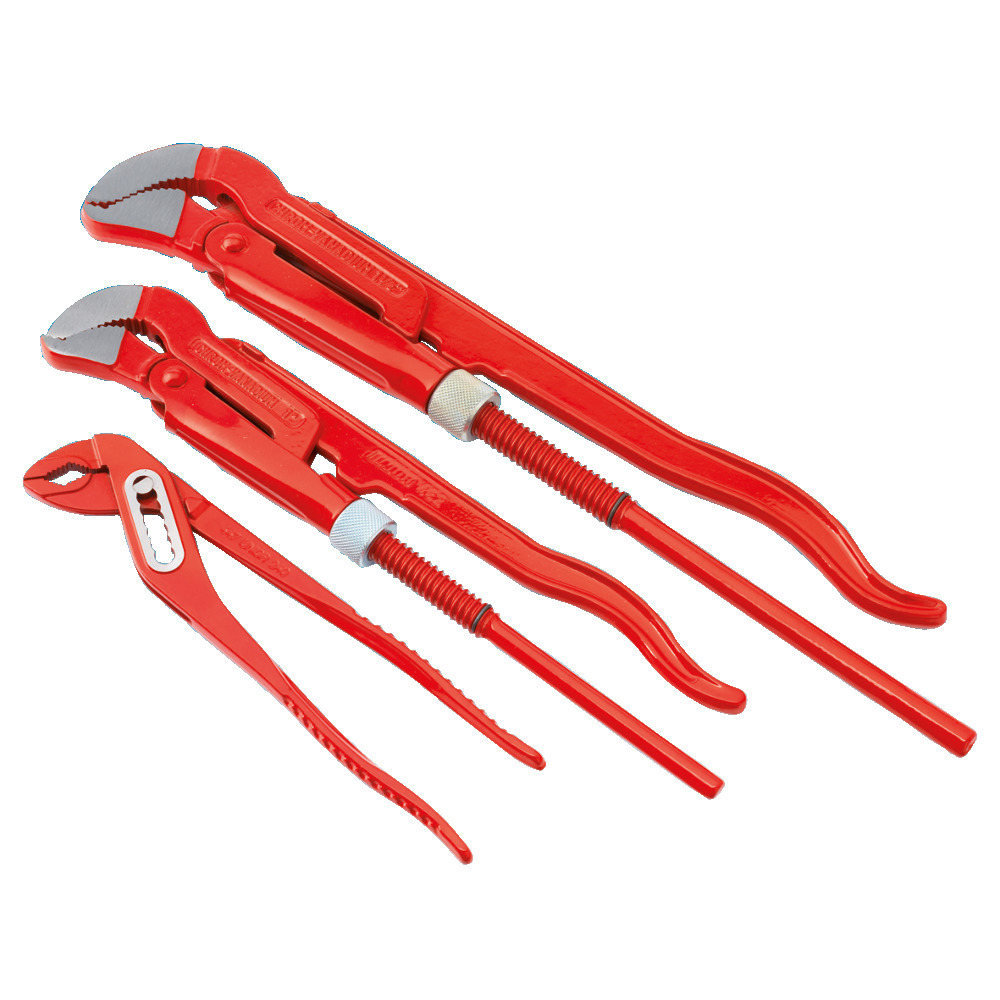 Profi-Eckrohrzangen mit geschwungenen Maul für Rohre bis 1″ und 1 1/2″ sowie eine 240mm Wapuzange mit Schnellverstellung im Set.