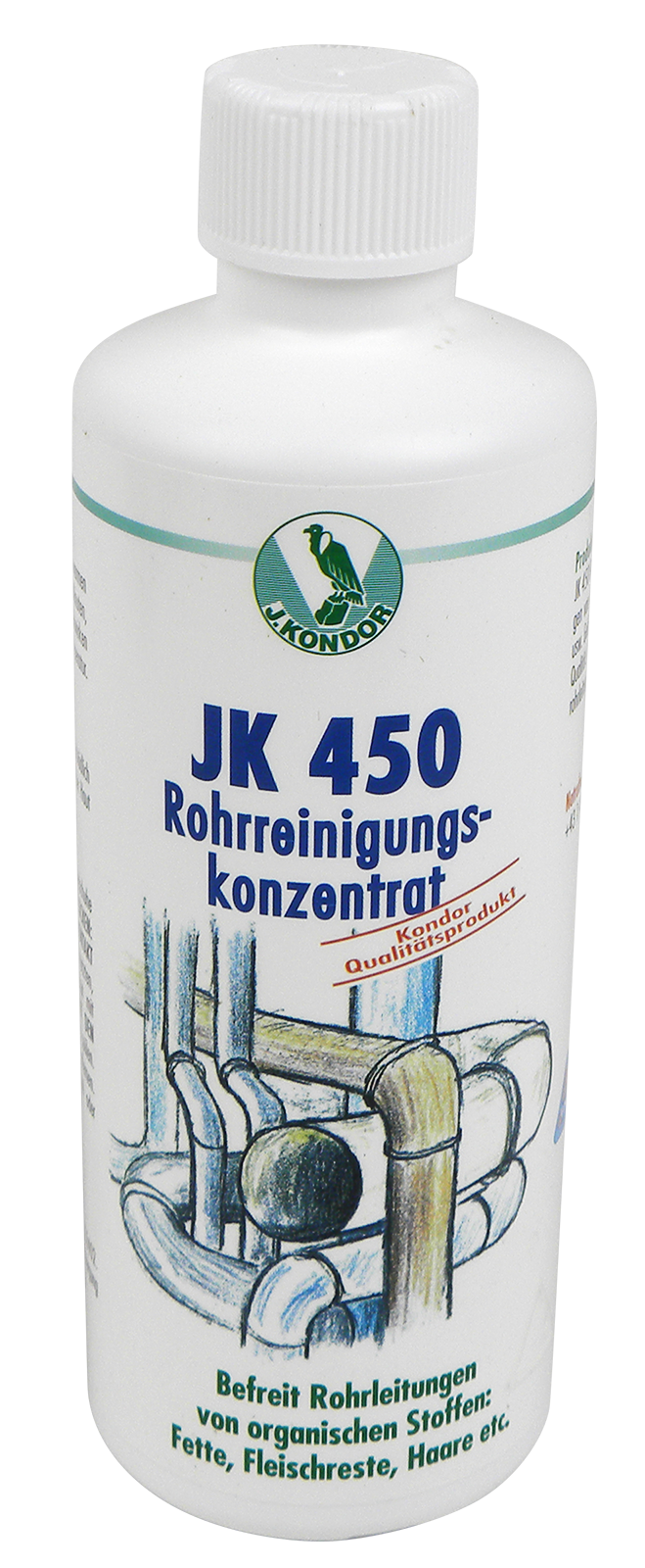 Rohrreinigungskonzentrat JK450befreit mühelos Rohrleitungen von organischen Stoffen wie Fette, Fleischreste, Haare, usw., Gefrieren und Bodensatzbildung, beeinträchtigen nicht die Qualität.Kein Angriff auf Dichtungen, Metall und Kunststoffrohrleitungen. Registrierungsnummer beim Umweltbundesamt unter 200400.Anwendung:1 Teil JK450, 2 Teile heißes Wasser einwirken lassen (mind. 15-30 min.) und nachspülen. Verarbeitung bei Raumtemperatur. Nicht auf Marmor oder Armaturen verwenden.Gefahrenhinweise:Verursacht schwere Verätzungen!Sicherheitsratschläge:Unter Verschluss und für Kinder unzugänglich aufbewahren. Bei der Arbeit nicht essen und trinken. Bei Berührung mit den Augen sofort gründlich mit Wasser abspülen und Arzt konsultieren. Bei der Arbeit geeignete Schutzhandschuhe und Schutzbrille, Gesichtsschutz tragen. Bei Unfall oder Unwohlsein sofort Arzt zuziehen (wenn möglich Etikett vorzeigen). Nur im Originalgebinde verschlossen aufbewahren.