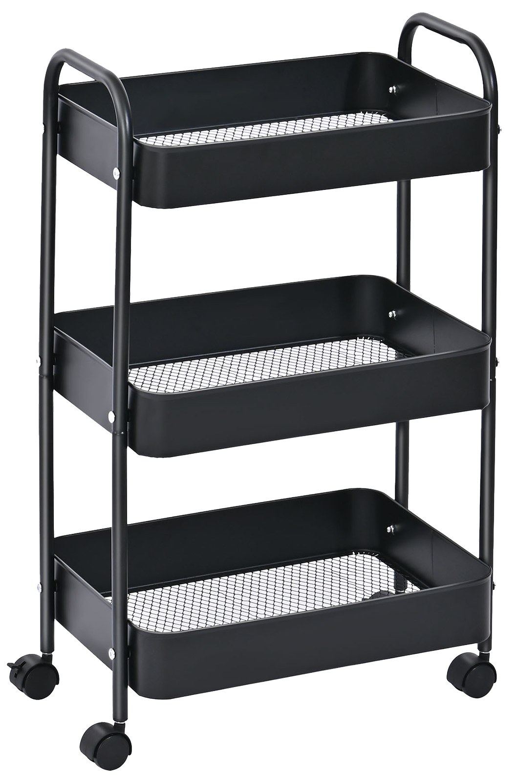 Mobiler Rollwagen mit 3 Ebenen aus pulverbeschichtetem Stahl. Schafft Ordnung in Werkstatt, Haushalt oder Vorratsraum und lässt sich dank der Rollen flexibel positionieren.