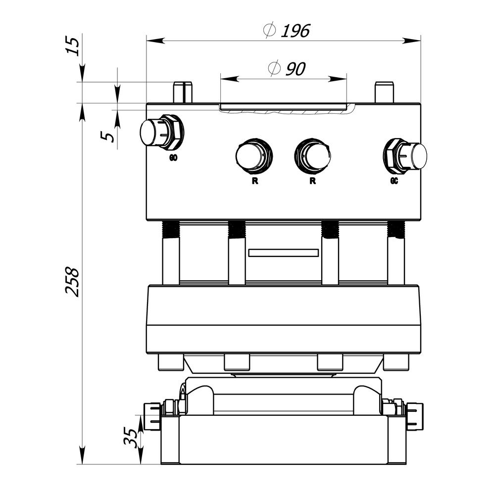 Flansch oben: 10-Loch (M 12 IG) mit Lochkreis 144 mm und zwei Stehbolzen.