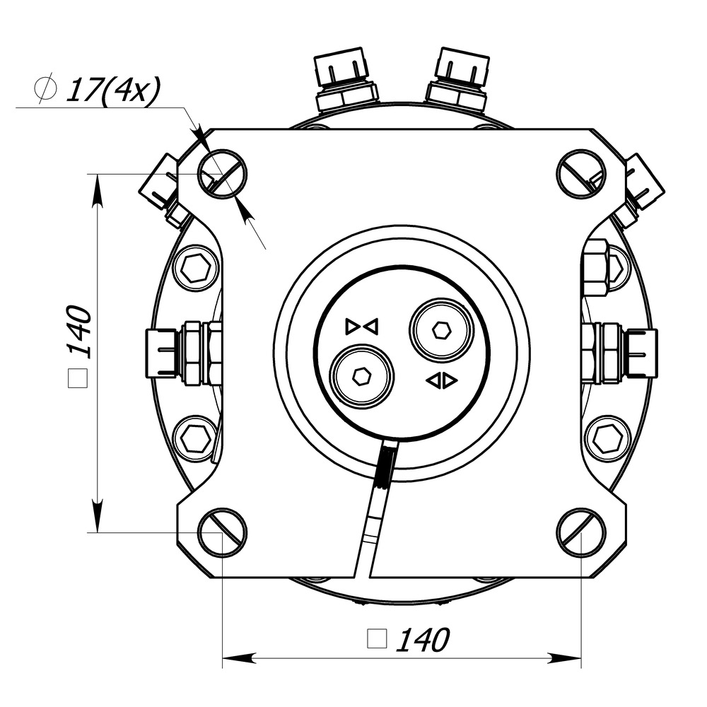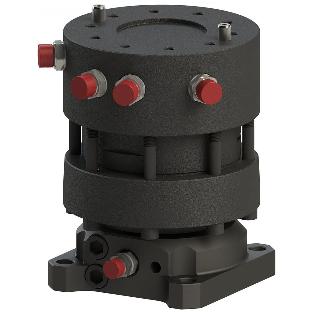 Flansch unten: 4-Loch-Flansch mit 140 x 140 mm Lochmaß, 17 mm Bohrung, Technische Daten: max. Axiallast 6,0 Tonnen (statisch), 3,0 Tonnen dynamisch max. 1850 Nm bei max. 250 bar, max. 300 bar für Greifer schließen, max. 200 bar für Greifer öffnen, erforderlicher Ölfluss 25 Liter/min., ohne Schläuche, Anschluss 1/2 Zoll, Gewicht 47 kg.