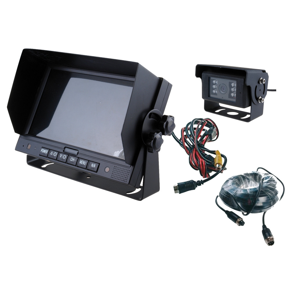 Komplettset mit 1 Monitor, 1 Kamera, 2 Halterungen (Standfuß selbstklebend bzw Bügelhalterung), Anschlusskabel und 18 m Verbindungskabel.Flacher Farb-TFT-Monitor mit internem Lautsprecher, 2 Kamera-Anschlüsse, Displaygröße: 7 Zoll Bildschirmdiagonale (ca. 18 cm), Helligkeit von 400 cd/m², Kontrast von 500:1, einsetzbar von 12 bis 32 Volt, Stromaufnahme 6 Watt, Spiegelfunktion in der horizontalen und vertikalen, automatische Ein- und Ausschaltung bei Anschluss an den Rückwärtsgang, Abstandslinien zuschaltbar, für ein noch einfacheres Rückwärtsfahren, Menü in 8 Sprachen, Größe des Monitors (BxHxT): 182x122x26 mm, Größe inkl. Halterung: 198x138x31 mm, Anschlusskabel 1,7m.Infrarot Rückfahrkamera 1/3 Sharp CCD-Farbsensor inklusive Mikrofon, Blickwinkel 120°, 300.000 Pixel, 420 TV Linien, Lichtempfindlichkeit 0 Lux, automatischer Gegenlichtabgleich, 12x Infrarot LEDs für eine Top-Nachtsichtfähigkeit bis 10 m, Stromaufnahme 250 mA, einsetzbar von ca. -20°C bis + 70°C, Schutzklasse IP68, Aluminium-Druck-Gehäuse, Video Ausgang 1.0Vp-p, 75 Ohm, Gewicht 600 g, Maße 110x85x70 mm.