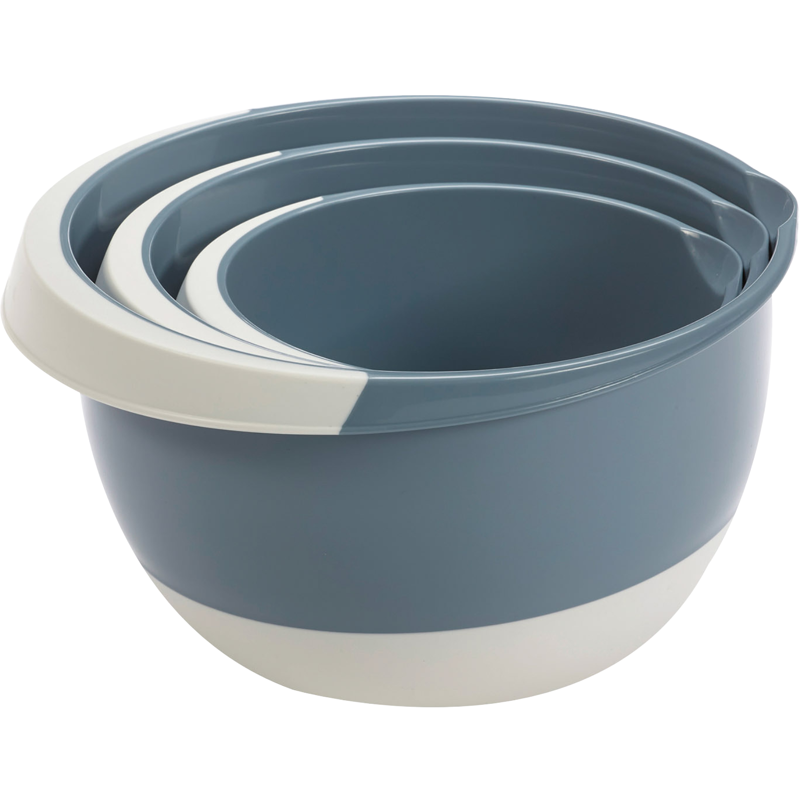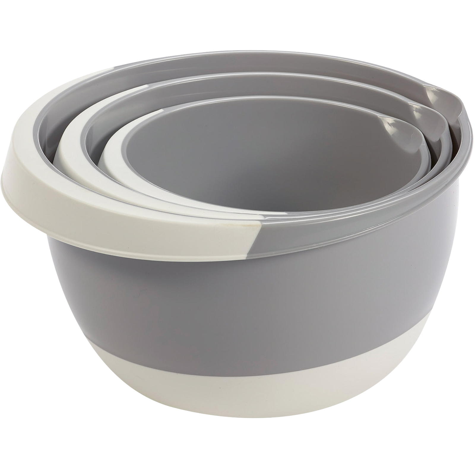 Rührschüsselset Highline – 3 Größen, unzählige MöglichkeitenMit diesem 3-teiligen Rührschüsselset sind Sie in der Küche bestens ausgestattet.Die Schüsseln mit 2 L, 3,5 L und 5 L Fassungsvermögen eignen sich ideal zum Rühren, Mixen, Vorbereiten und Servieren – egal ob für kleine Portionen oder große Mengen.Dank der praktischen Größenabstufung lassen sich die Schüsseln platzsparend ineinander stapeln.Der stabile Kunststoff ist lebensmittelecht, spülmaschinengeeignet und besonders robust.Die weite Öffnung erleichtert das Arbeiten mit Schneebesen, Rührgerät oder Teigspatel.Farblich sortiert – eine Auswahl der Farbe ist nicht möglich.Ein vielseitiges Set für den täglichen Einsatz – funktional, pflegeleicht und formschön.Inhalt: 2, 3,5, und 5 LiterDurchmesser: 27 cm, 22,5 cm, 19 cmHöhe: 15 cm, 14 cm, 12 cm