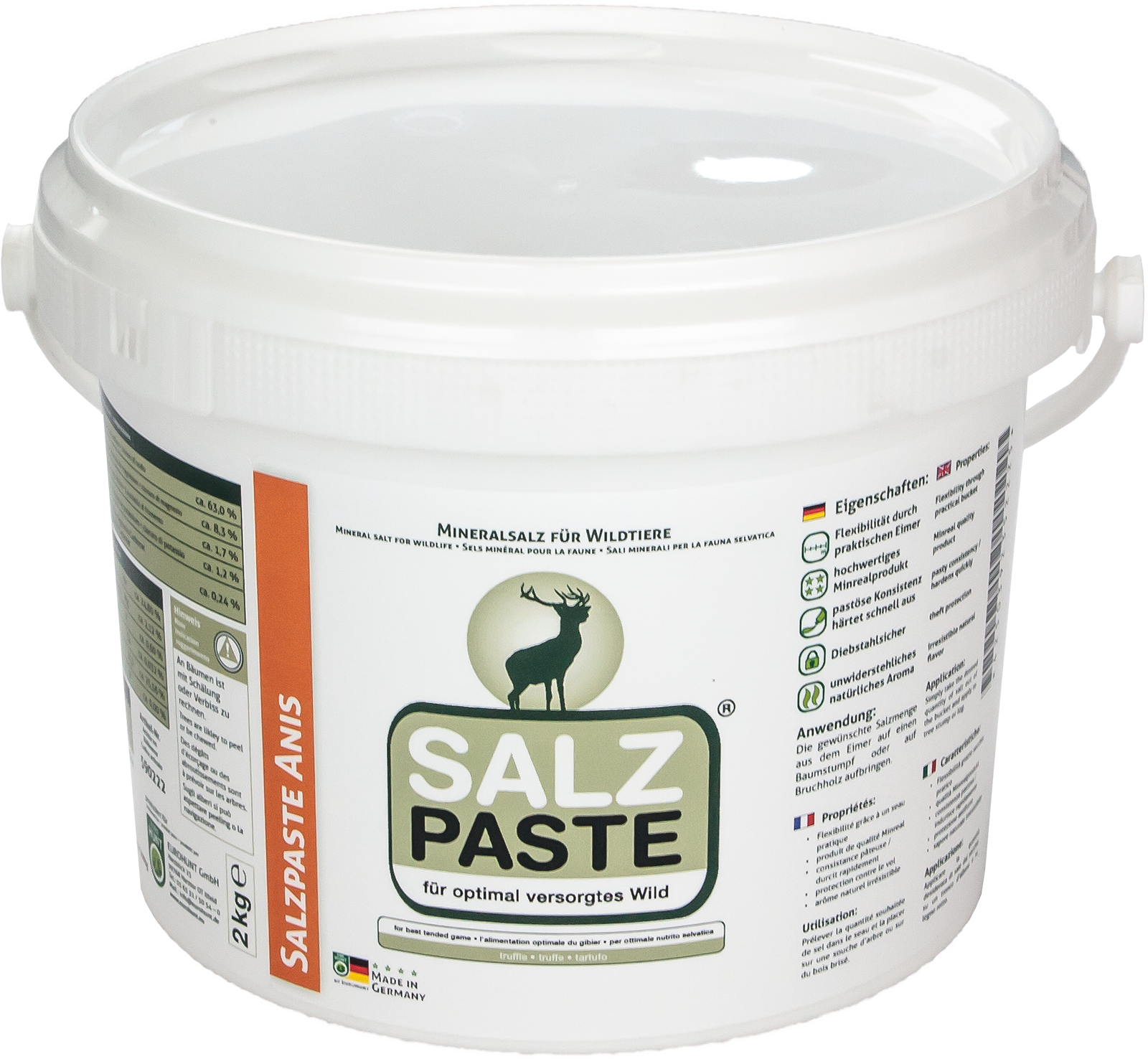 Optimale Versorgung für Ihr Wild! Hochwertiges Mineralprodukt als Paste. Gewünschte Salzmenge auf einen Baumstumpf oder Bruchholz aufstreichen und aushärten lassen. Durch die flexible Anwendung besteht die Möglichkeit, das Wild an jeder gewünschten Stelle im Revier optimal mit den erforderlichen Salzen und Mineralien zu versorgen. Variante: Anis (natürlicher Aromastoff) Wildarten: Rot-, Reh- Damm- und Muffelwild handliches Gebinde: 2 kg.