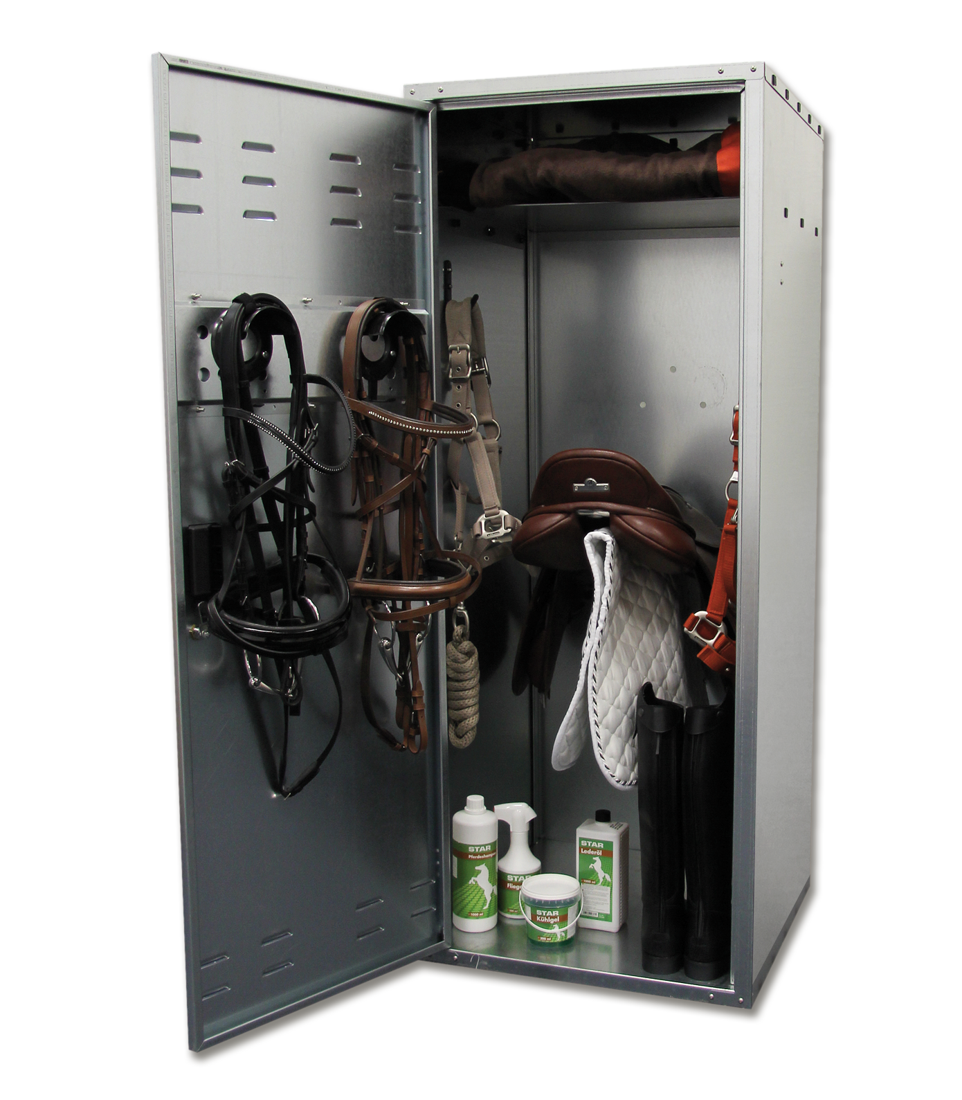 Gefertigt aus verzinktem Metall ist der Sattelschrank besonders langlebig und pflegeleicht.