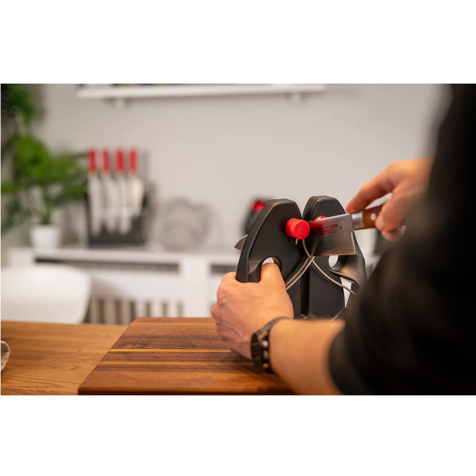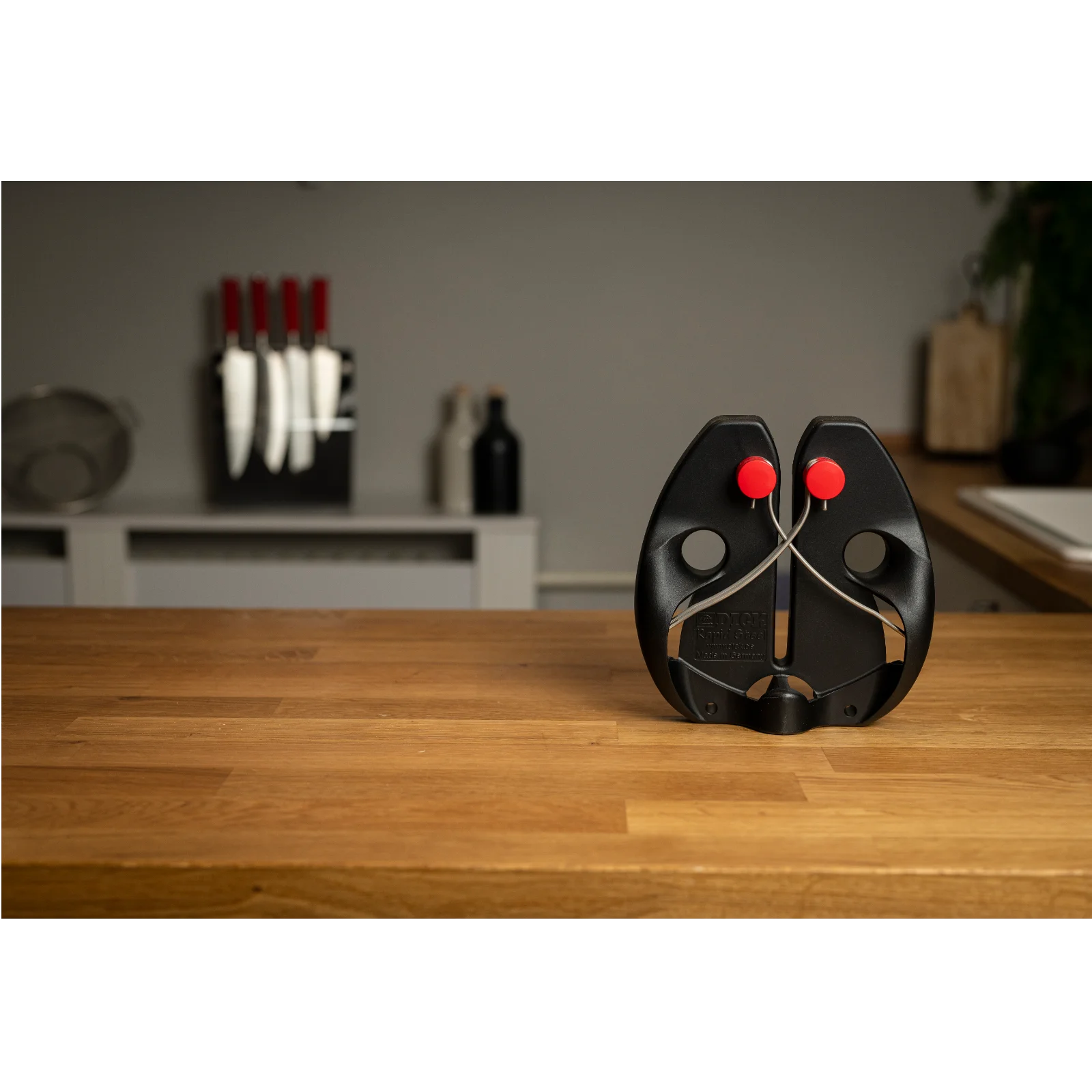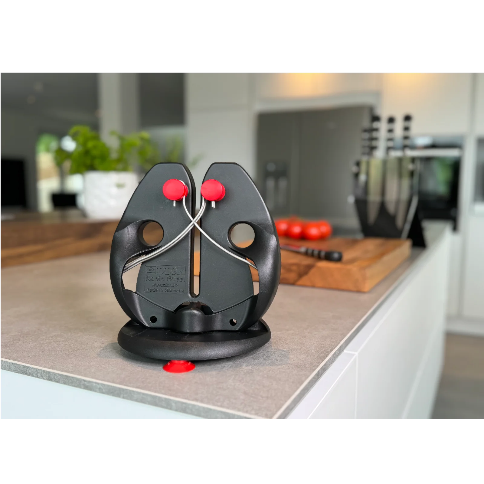 Messerschärfen leicht gemacht - Dick Rapid Steel ActionAktions-Set inkl. Standplatte!!!Dieser Dick Rapid Steel Action bringt Ihre stumpfen Messer wieder auf die optimale Schärfe. Die Schärfstäbe von Rapid Steel verfügen über eine verschleißfeste, superharte Spezialbeschichtung und sorgen so für einen hohen Abtrag.Rapid Steel Action ermöglicht eine mühelose Handhabung durch den bereits vorgegebenen Schärfwinkel. Eine sichere Führung des Messers ist garantiert. Der richtige Winkel machts möglich - Dick Rapid Steel ActionDurch leichten Druck das Messer bogenförmig durch den Spalt des Schärfegerätes ziehen. Das leichte Durchziehen mehrmals wiederholen. Damit sind auch für Sie stumpfe Messer kein Thema mehr. Die besonderen Vorteile des Dick Messerschärfers Rapid Steel Action: