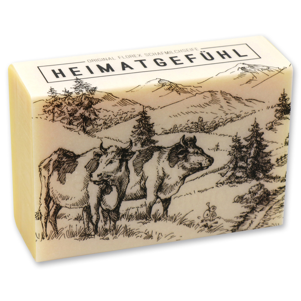 Original Florex Schafmilchseife ist durch ihre hochwertigen Inhaltsstoffe besonders hautverträglich und eignet sich daher auch hervorragend für empfindliche Haut. 100 g mit Schleife ″Heimatgefühl″.