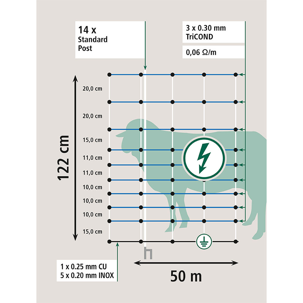 Spezieller Schafzaun/Weidenetz. Ideal auch als Wolfabwehrnetz - extra hoch (122 cm)Mit optional anschließbarer, verstärkter Bodenlitze zur Erdung über die gesamte Netzlänge bei schwierigen Bodenverhältnissen (z.B. sehr sandige oder trockene Böden). Mit 9 x TriCond Reihen à 3 x 0,30 mm.14 integrierte weiße Kunststoffpfähle mit verzinkter Bodenspitze (Doppelspitze). Widerstand 0,06 Ohm. 3 Jahre Garantie gegen UV-Schäden.