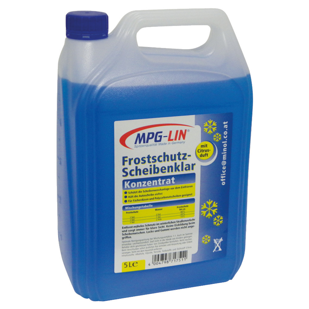 Konzentrat - verdünnbar mit bis zu 3 Teilen Wasser = 15 Liter.Top-Frostschutz für alle KFZ Scheibenwaschanlagen mit Reinigungssubstanzen.Auch im Sommer als Reinigungskonzentrat verwendbar.Ungiftig, methanolfrei.<Hohe Frostsicherheit, verhindert Schlierenbildung, Langzeitwirkung.<<unverdünnt bis -60 °C,verdünnbar:Frostschutz : Wasser 2 : 1 bis - 30 °C 1 : 1 bis - 20 °C 1 : 2 bis - 14 °C 5 Liter Behälter.