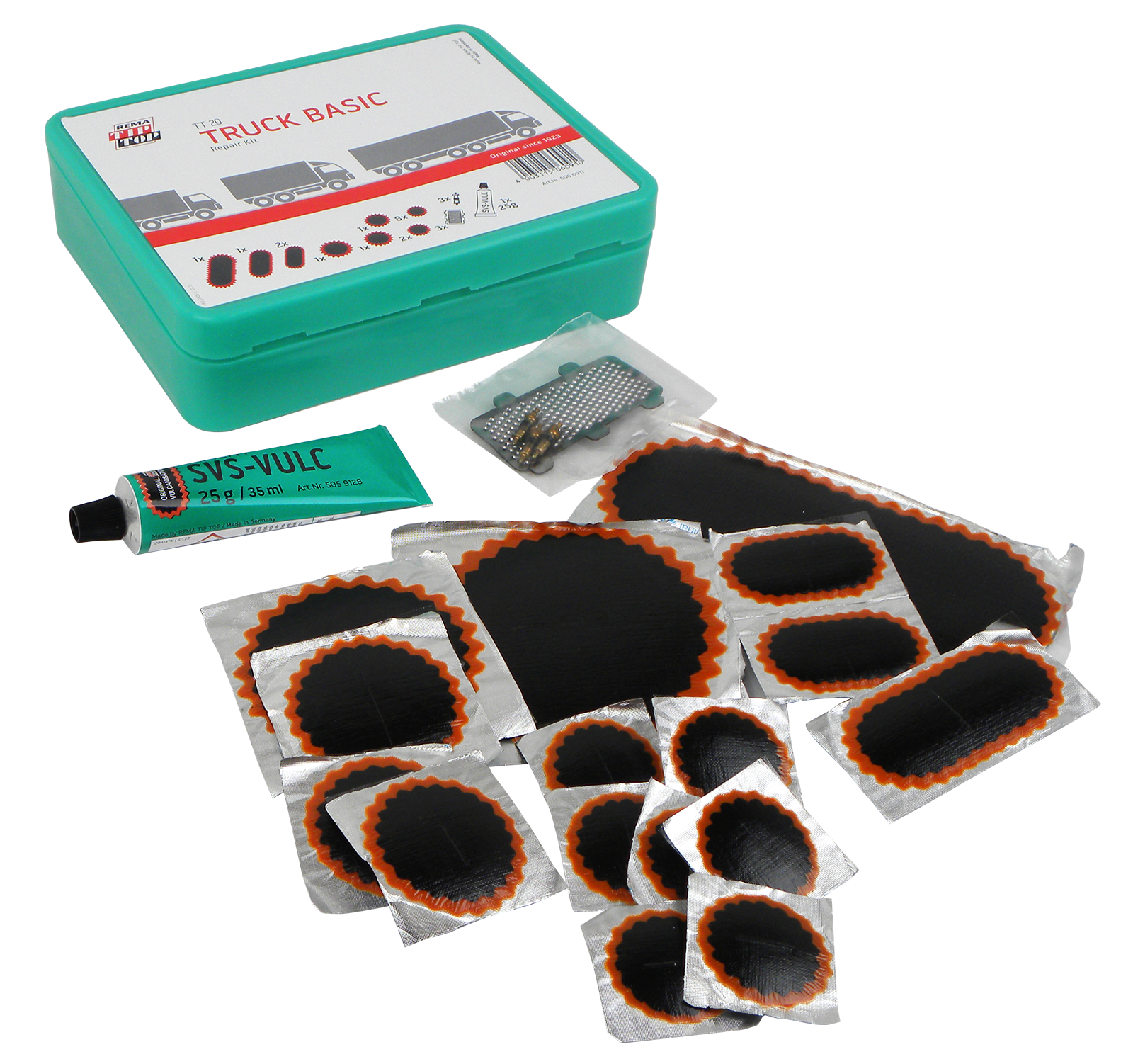 26-teilig, mit 17 Flicken,1 Tube SVS-Lösung 25 g, 3 Raubleche, 3 Ventileinsätze kurz, für Land-/Baumaschinen.