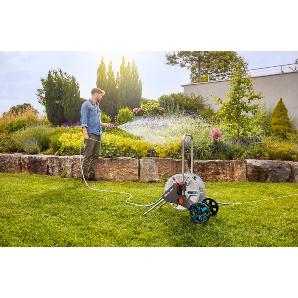 Schlauchwagen im Set mit 20 m Classic Schlauch, allen Anschlüssen und Reinigungsspritze. Hochwertige Ausführung in bester Gardena Qualität.